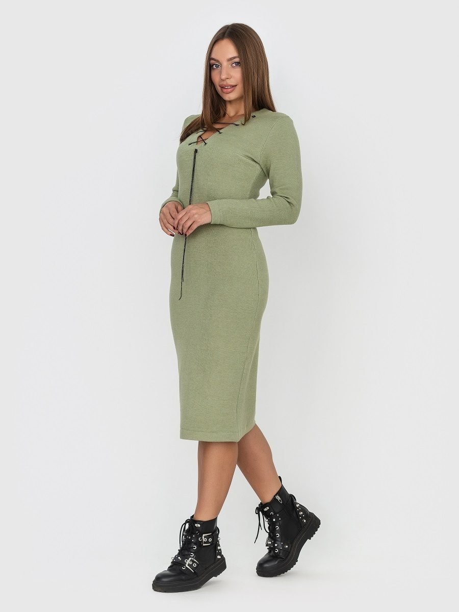 Затишне і тепле плаття Мірабель володіє лаконічним дизайном і актуальною в цьому сезоні довжиною міді. Сукня прилеглого силуету ідеально сідає по фігурі, підкреслюючи її жіночні вигини. Ефектне виконання має область декольте, доповнена металевою шнурівкою.