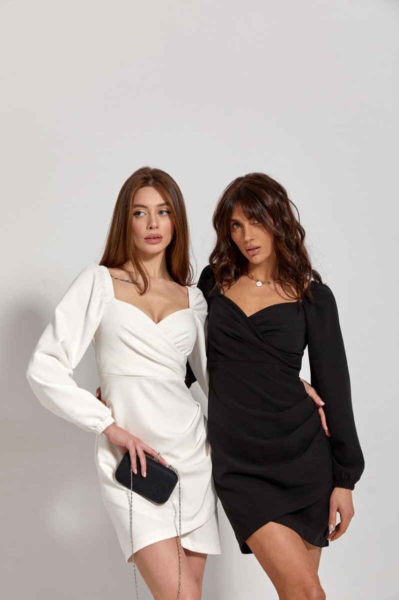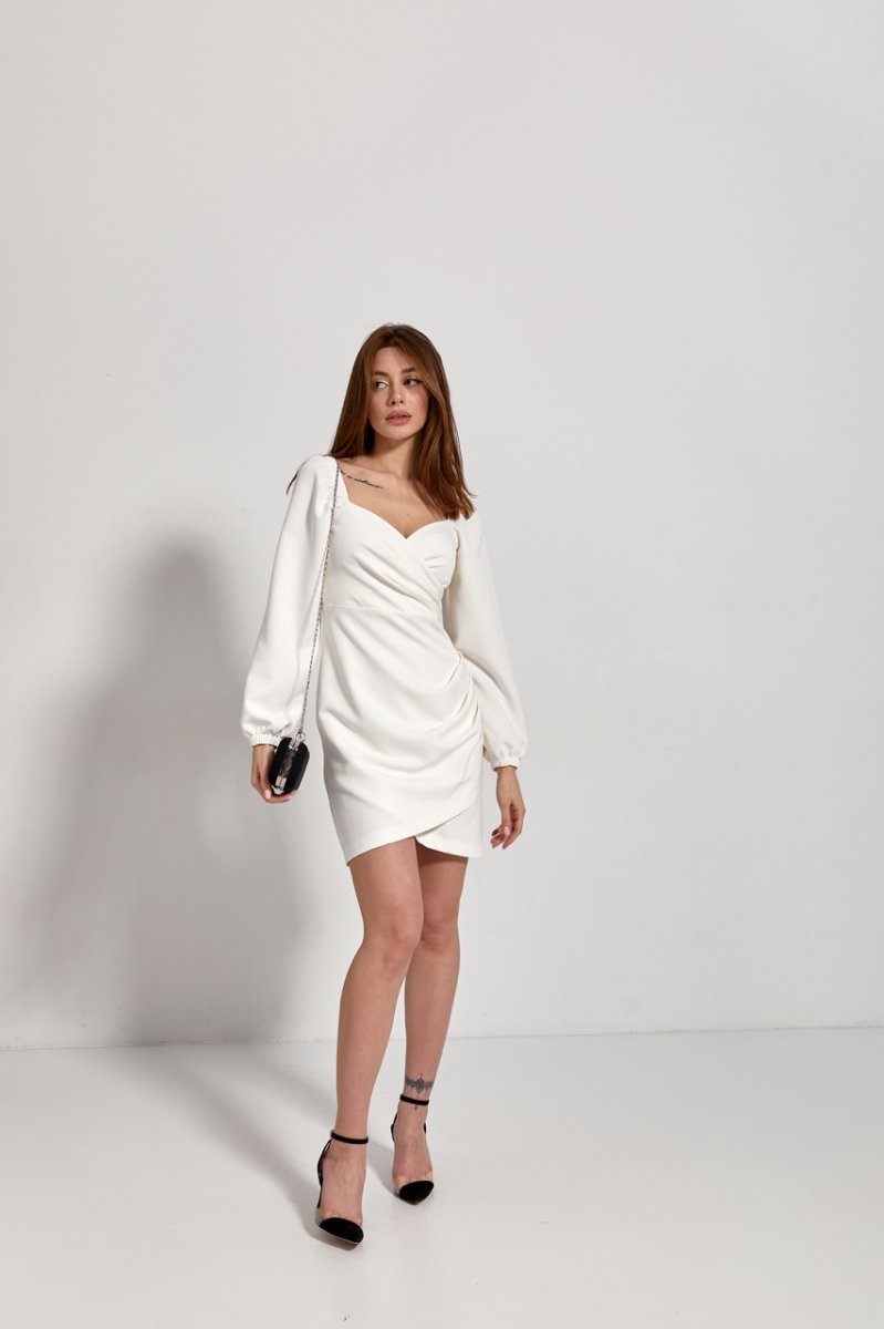 Сукня на запах зі складками. Перед відрізний вище рівня талії. Рукава довгі, фантазійні. Верхня частина рукава зібрана резинкою і являється брителью, низ рукава також зібраний. Спинка з талієвими виточками. Застібка потайна тасьма блискавка в середньому шві.