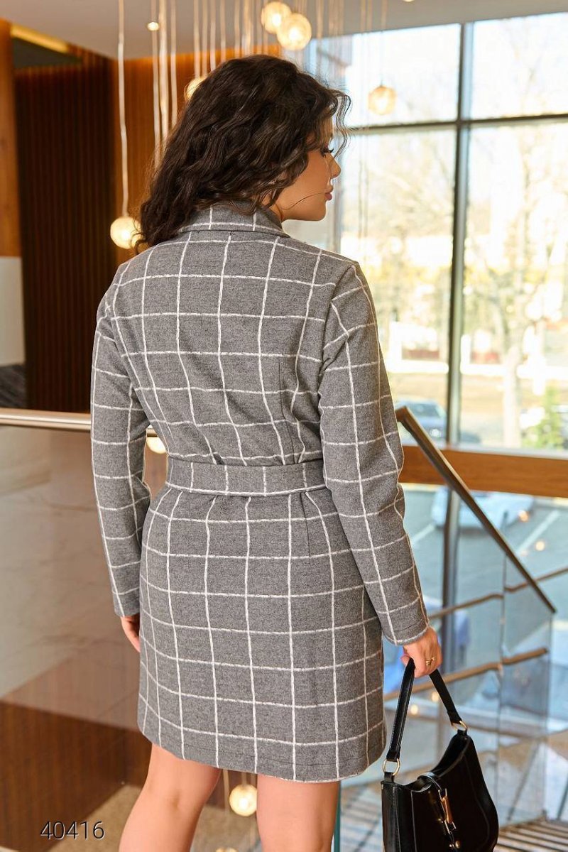Сукня-піджак з підплічниками, застібається на гудзики, пояс у комплекті. Тканина: стрейч кашемір із вовною.