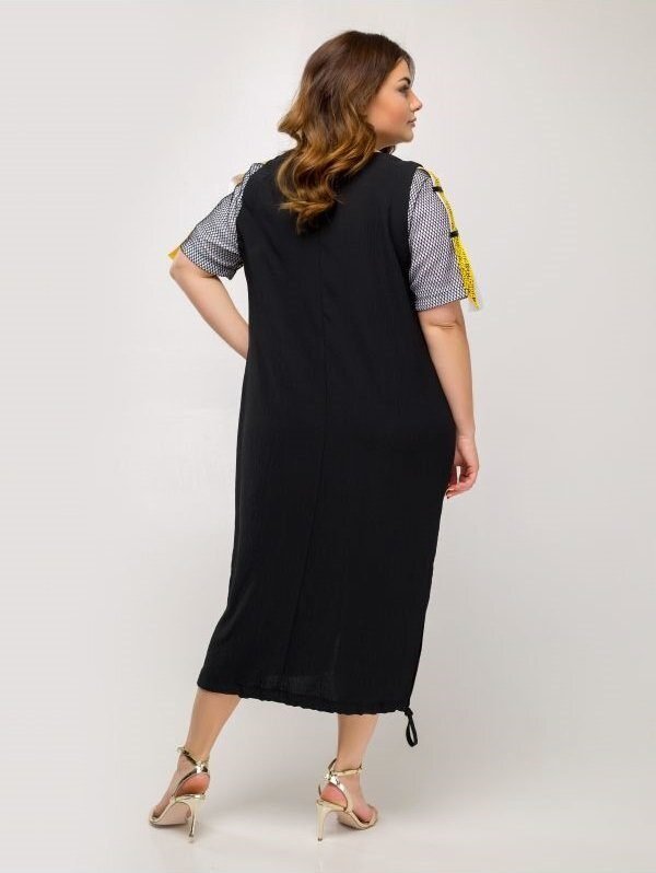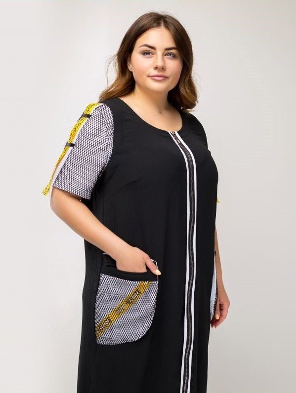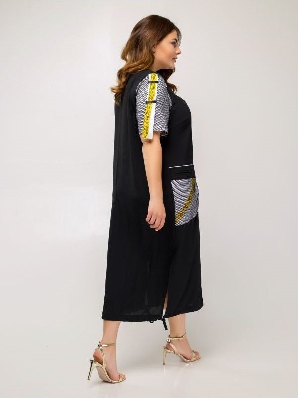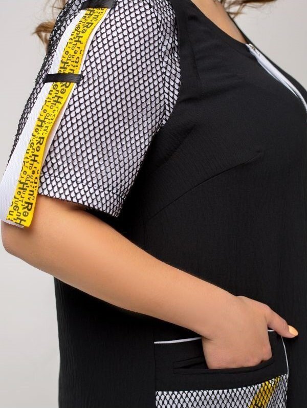 Жіноче плаття Ребека вільного крою виконана в оригінальному стилі спорт-шик. Модель з комфортного, дихаючого матеріалу. Сукня оформлено місткими накладними кишенями і декороване сіткою і різнокольоровими стрічками. По низу проходить куліса. Застібається по центру на металеву блискавку. У нижній частині вирізи з боків.