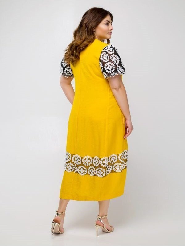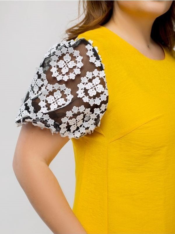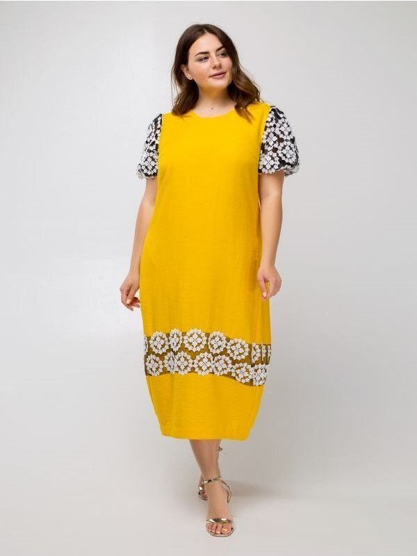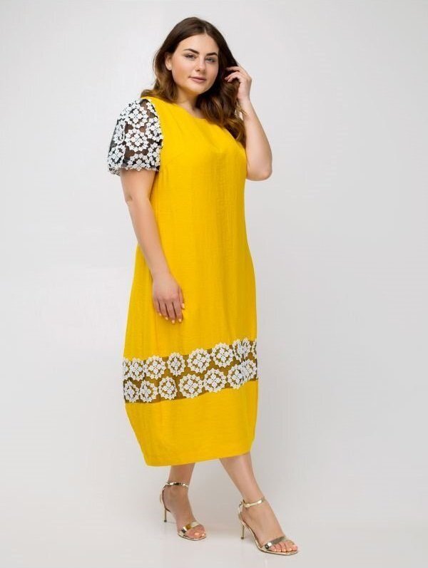 Сукня вільного крою яскравого, насиченого кольору. Прикрашає виріб сітка з вишивкою. Манжети рукавів-ліхтариків на гумках. Низ плаття злегка звужений, завдяки чому силует виглядає стрункішою і жіночні. В бокових швах прорізні кишені.