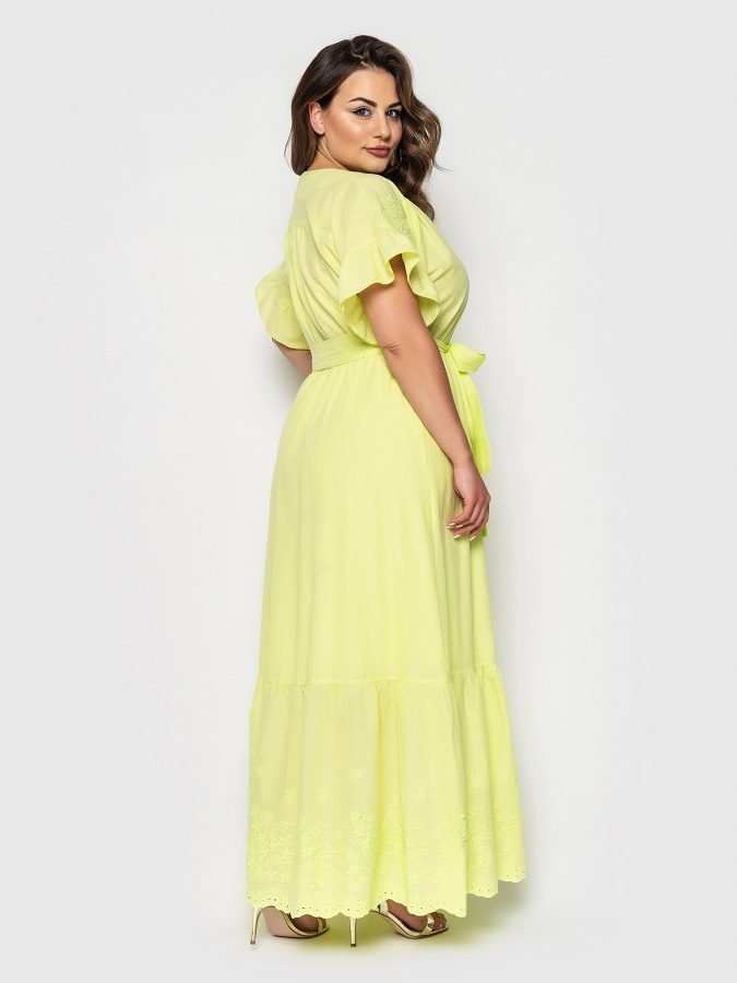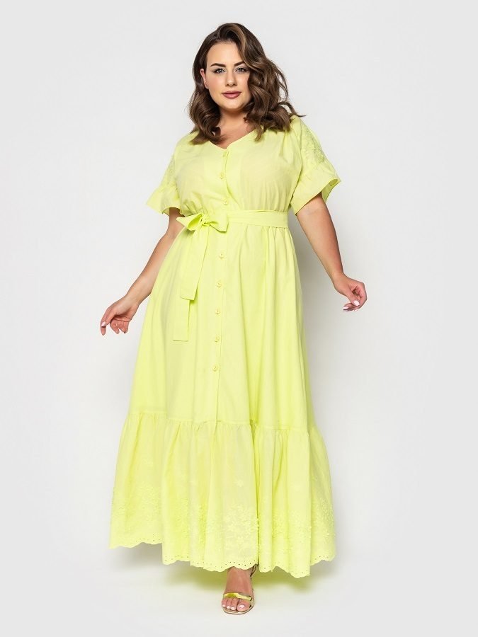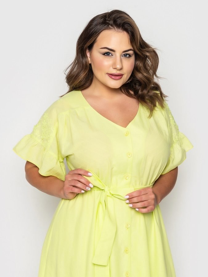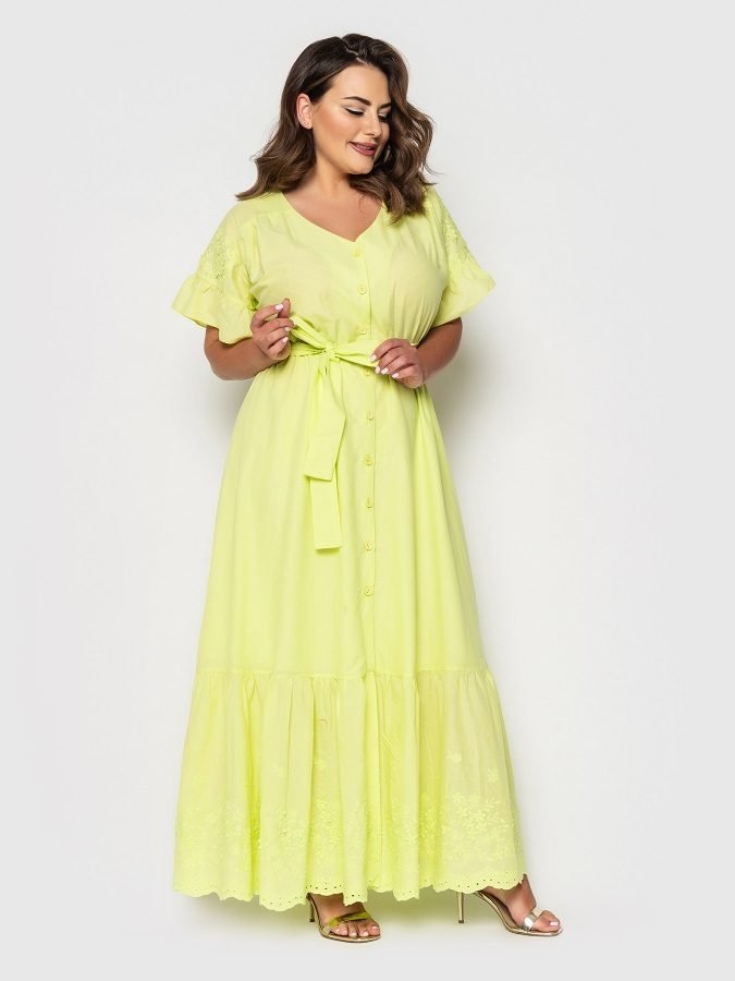 Пишна сукня з батисту з вшитим під'юбником з основного матеріалу. Застібається по переду на гудзики. Низ сукні з воланом, доповненим вишивкою та аплікацією. Аплікація і вишивка присутній так само на рукавах. Манжети з оборкою. Пояс в комплекті.