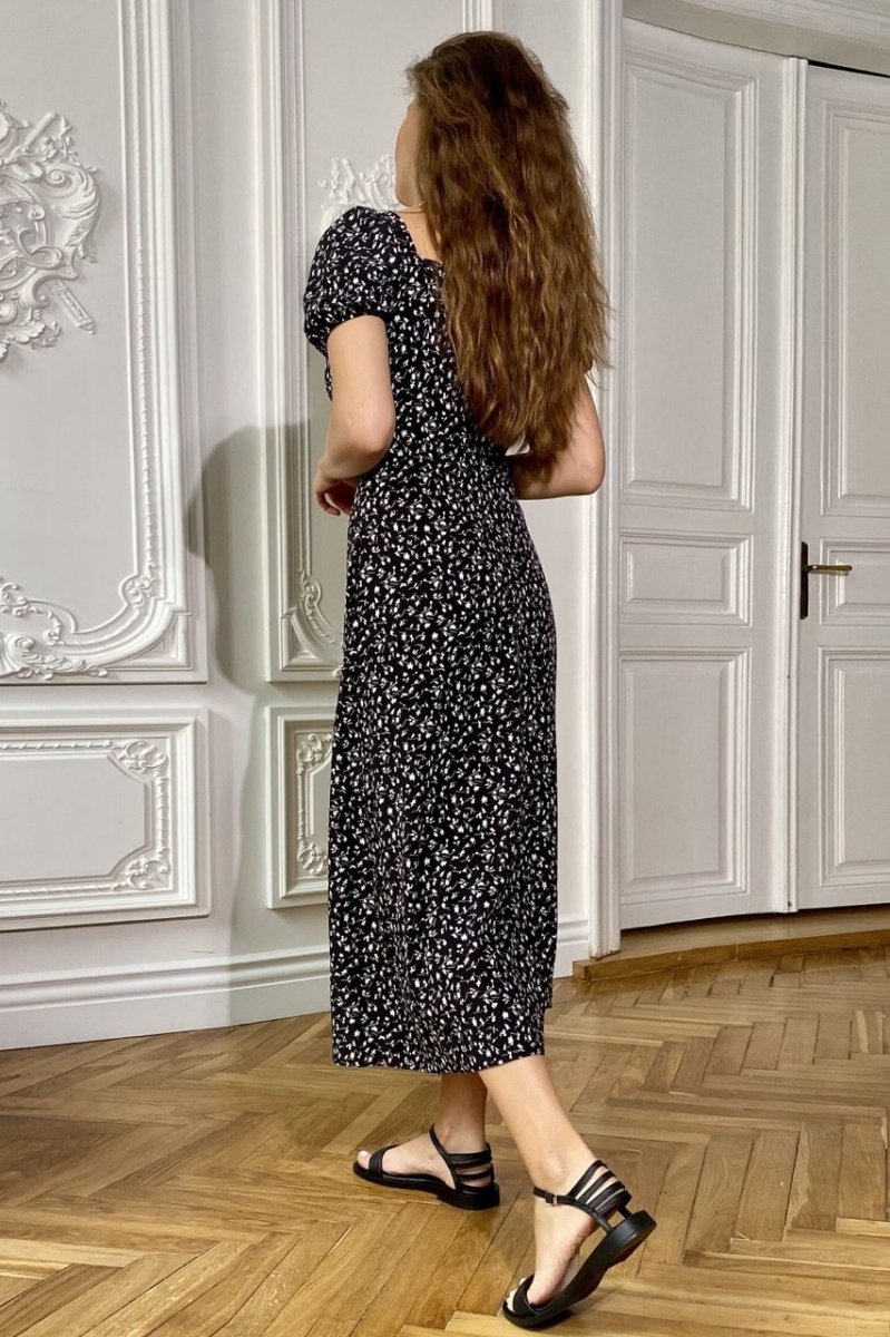 Нова сукня – це поєднання жіночного силуету з ніжним принтом дрібних польових кольорів. Романтична сукня-міді чудово вписується у тренди літа 2022. Виріб з ліфом з куліскою доповнили широким поясом, що акцентує, лінію талії. На спідниці зроблено високий розріз спереду. Короткі рукави драпірують еластичні елементи.
