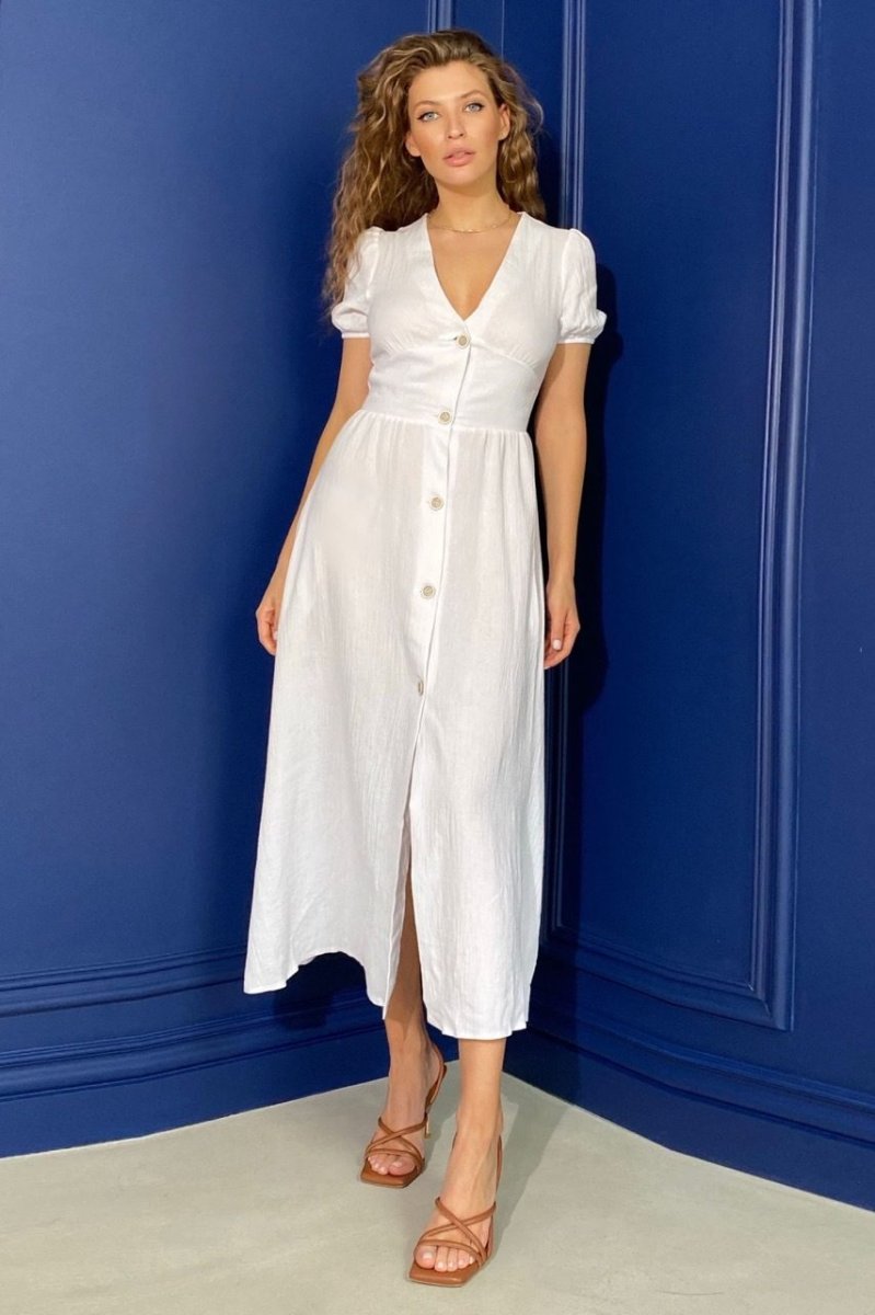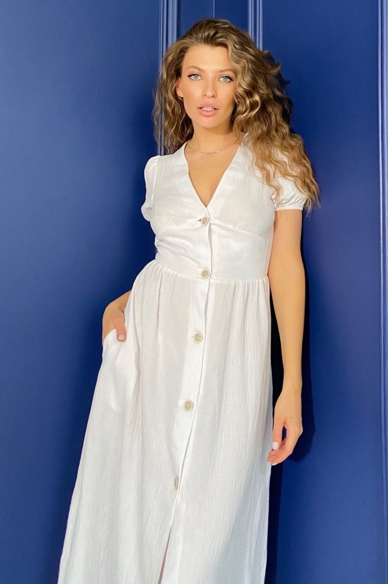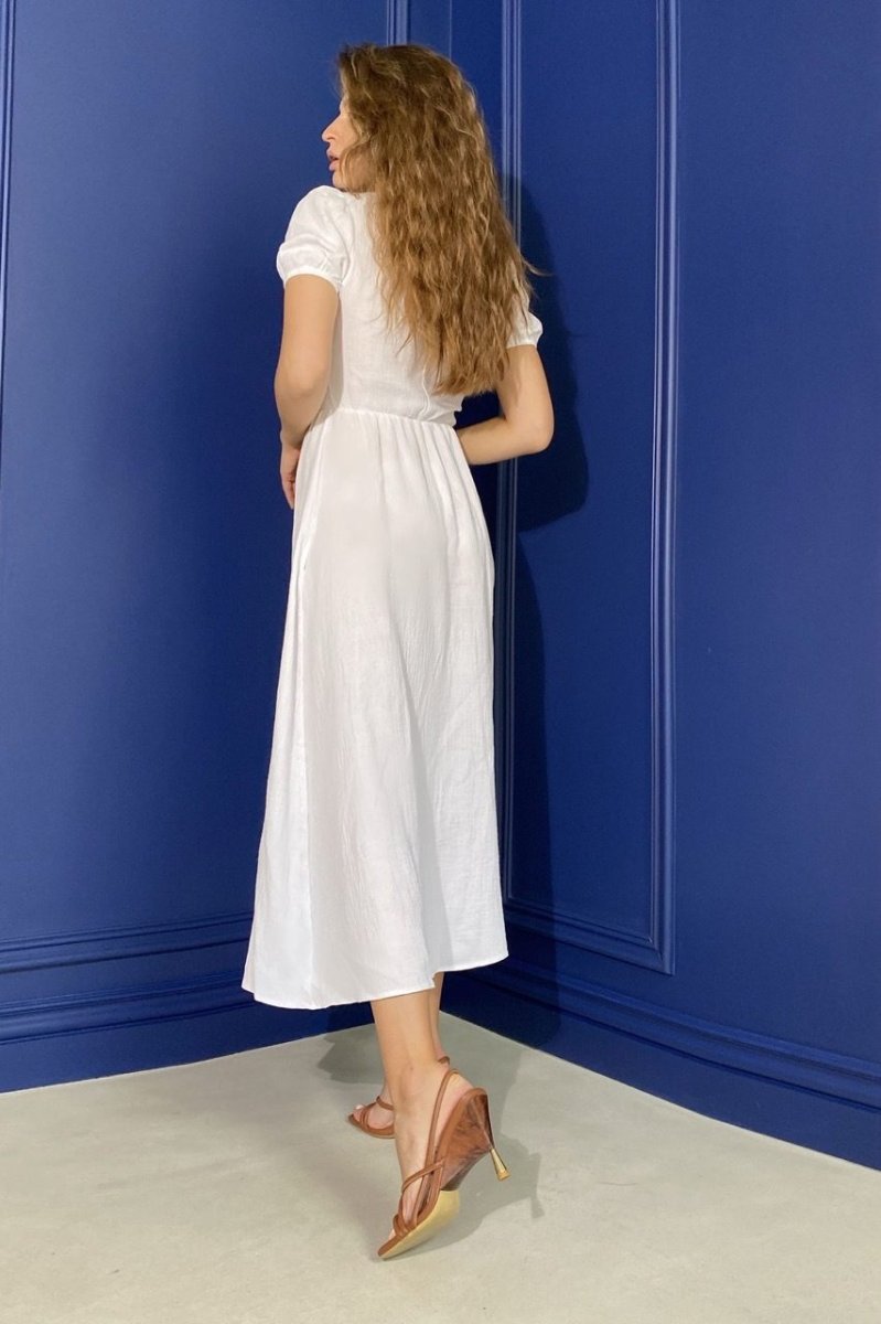 Cукня-міді з контрастним кольоровим принтом — ідеальний рецепт для створення романтичного настрою. Фігурний V-подібний виріз і короткі рукава на резинці підкреслять ключиці і акцентують увагу на декольте. Напів-прилеглий крій новою сукні прийдеться до смаку найвибагливішій модниці. Ідеальне рішення на будь-який тип фігури.