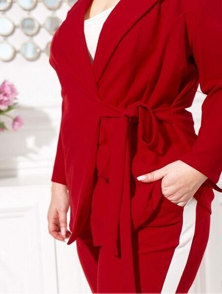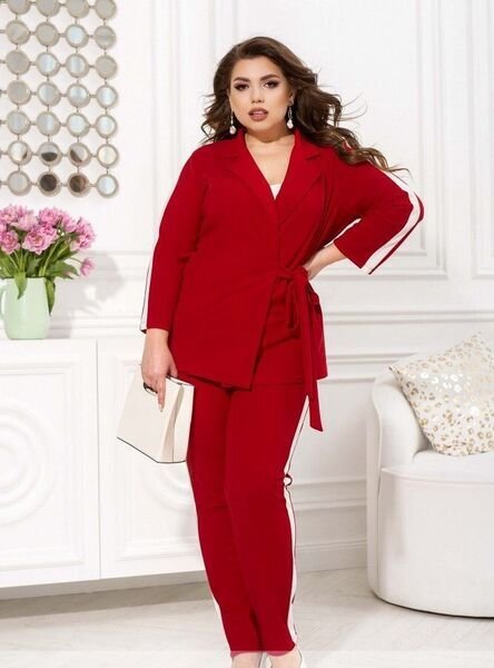 Мінімалістичний привабливий костюм з жакетом та брюками допоможе створити дійсно стильний та яскравий образ. Жакет без підкладки, доповнений відкладним коміром із лацканами, зав'язується на підшитий збоку поясок. Класичні штани з лампасами та карманами застібаються на змійку та ґудзик спереду.