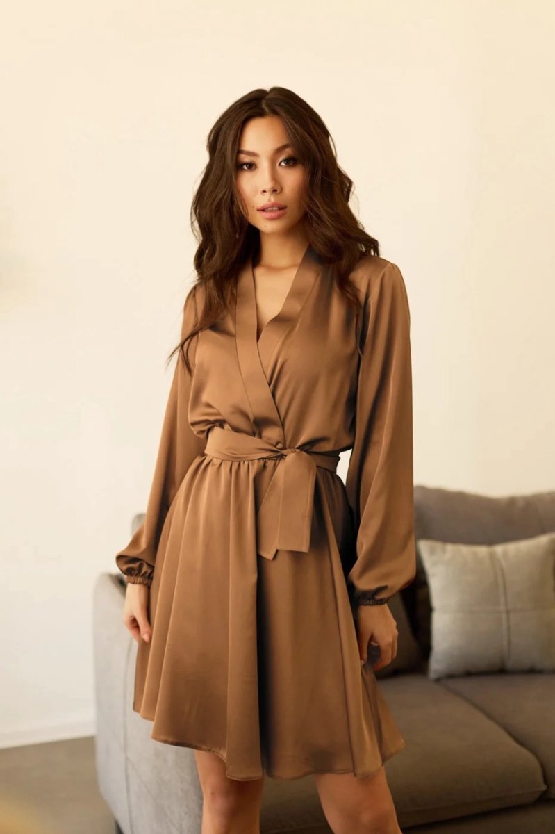 Пишна сукня вільного крою. Виріз горловини V-подібний. Рукави довгі, пишні. Сукня йде на запах. Пояс знімний. Матеріал: шовк Армані.