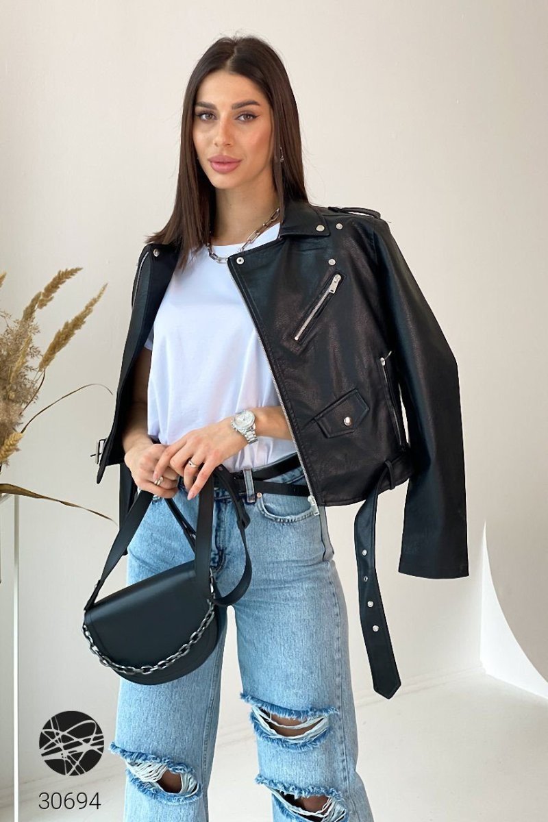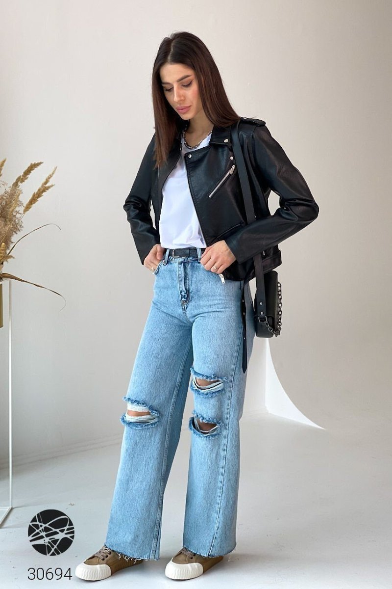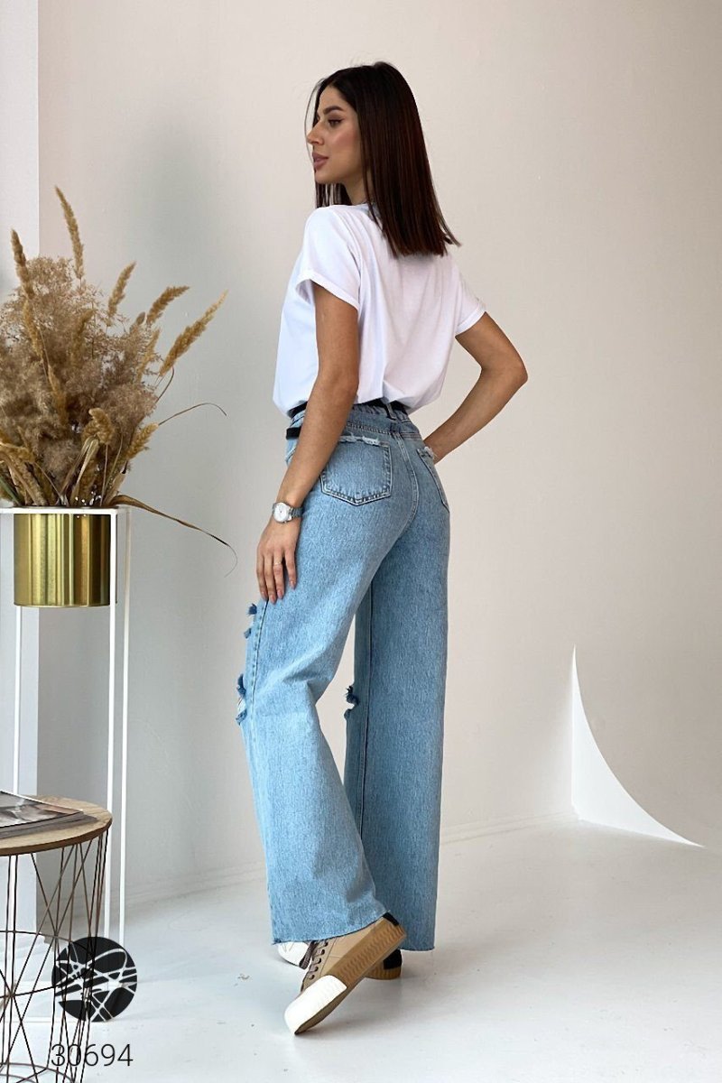 Джинси в вінтажному стилі з щільного якісного котону, виробництва Туреччини. Завищена талія, шлевки, бічні прорізні кишені і накладні кишені ззаду. Прихована ширінка із застібкою на блискавку і гудзик, розрізи з необробленими краями. Склад тканини: 98% - котон, 2% - еластан.