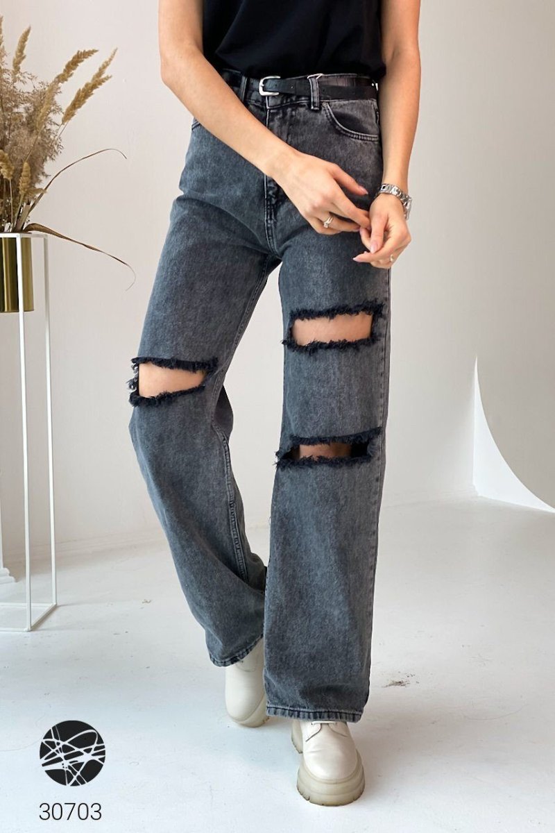 Джинси в вінтажному стилі з щільного якісного котону, виробництва Туреччини. Завищена талія, шлевки, бічні прорізні кишені і накладні кишені ззаду. Прихована ширінка із застібкою на блискавку і гудзик, розрізи з необробленими краями. Склад тканини: 98% - котон, 2% - еластан.
