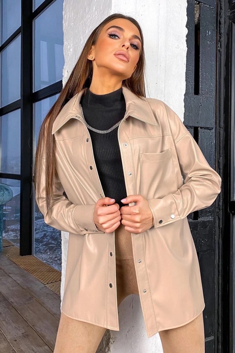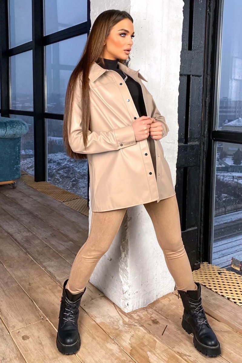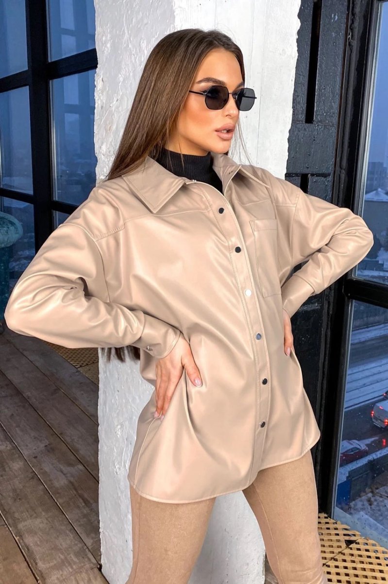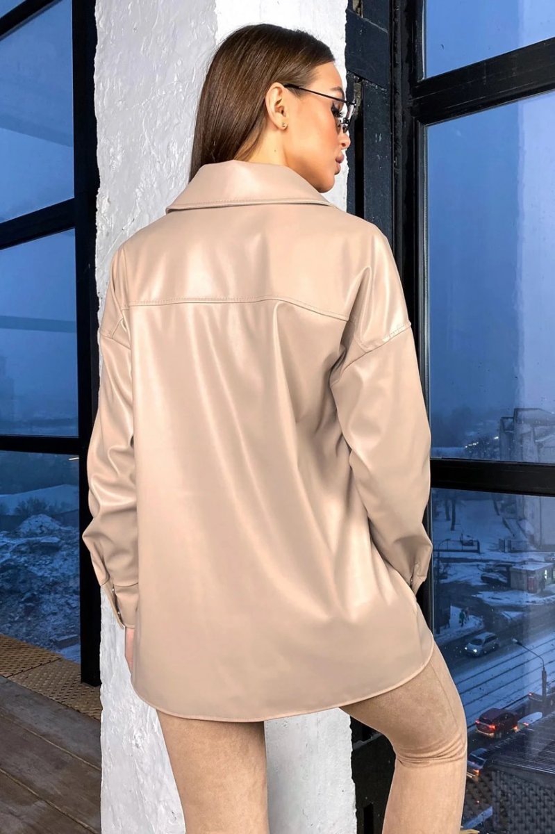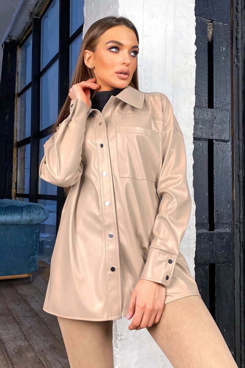 Еко-шкіра – матеріал, який ніколи не вийде із моди. Шкіряна сорочка має вільний рівний крій. Застібається на кнопки. Спереду є накладна кишеня.