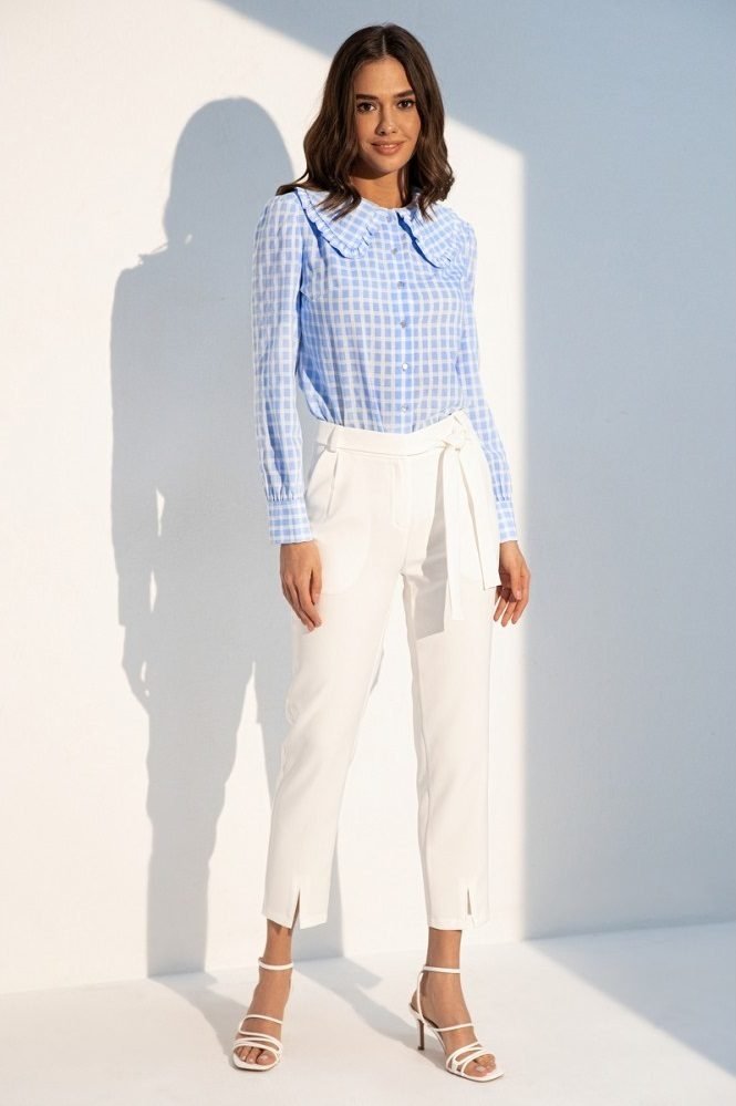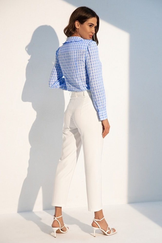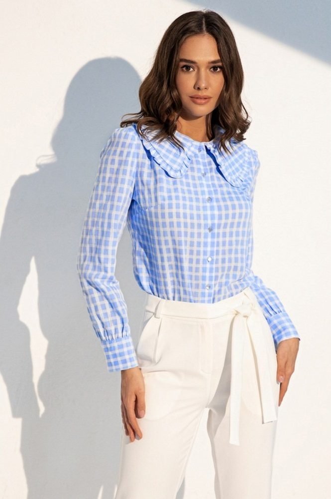 Сорочка в клітку з великим відкладним коміром прикрашеним романтичними оборками. Застібається на гудзики. Вільний крій моделі підходить для будь-якої фігури.