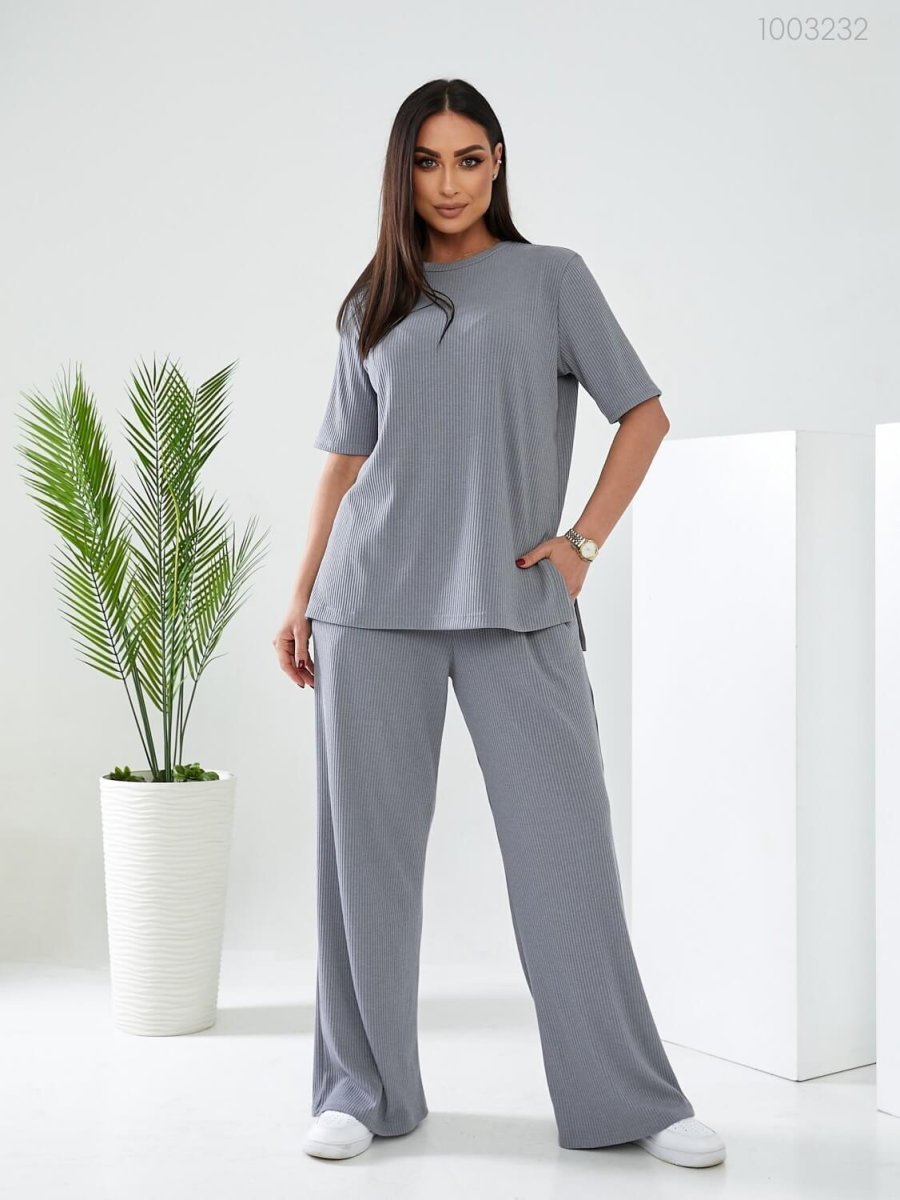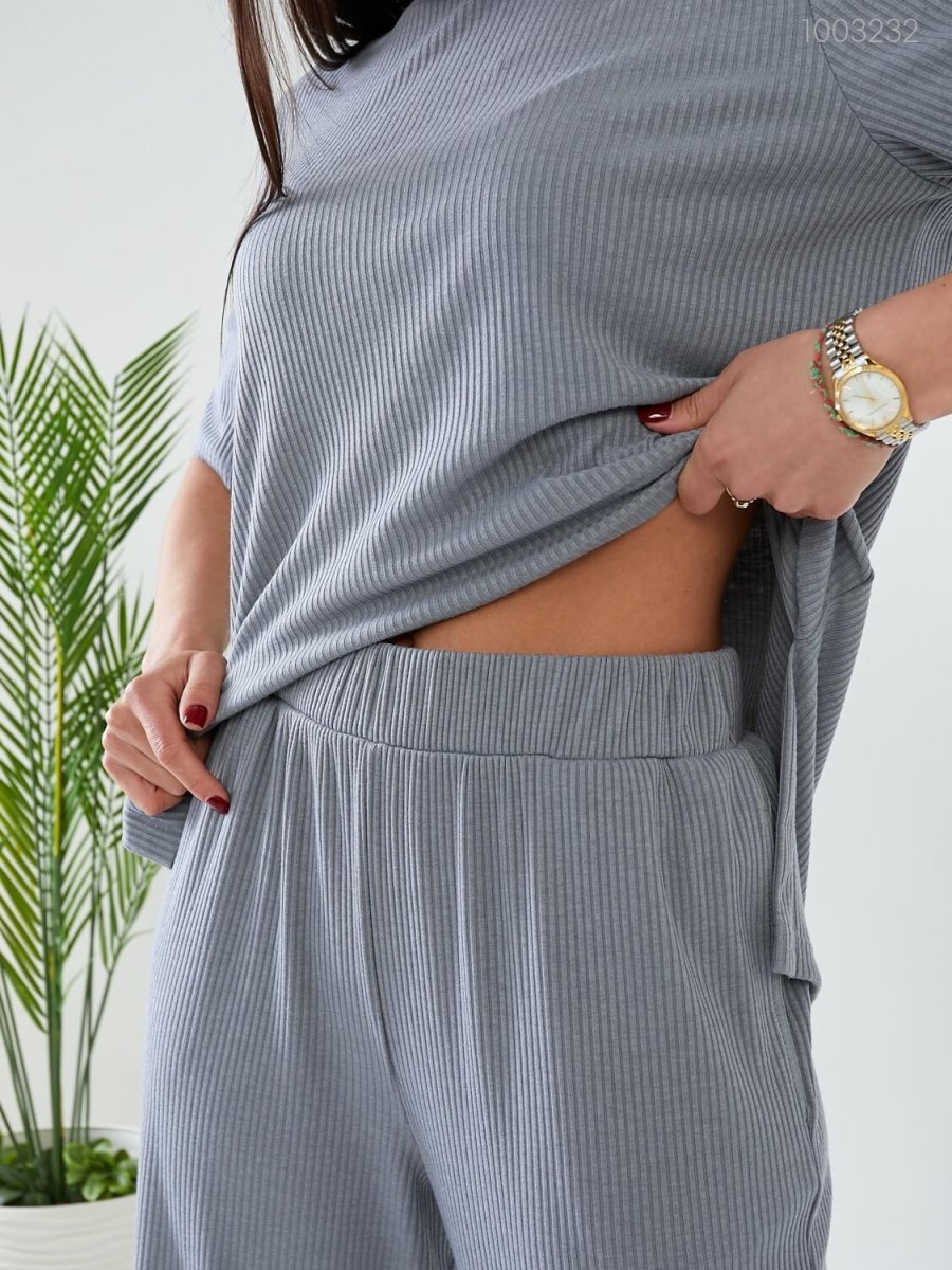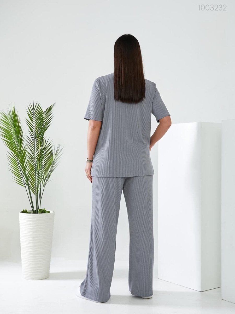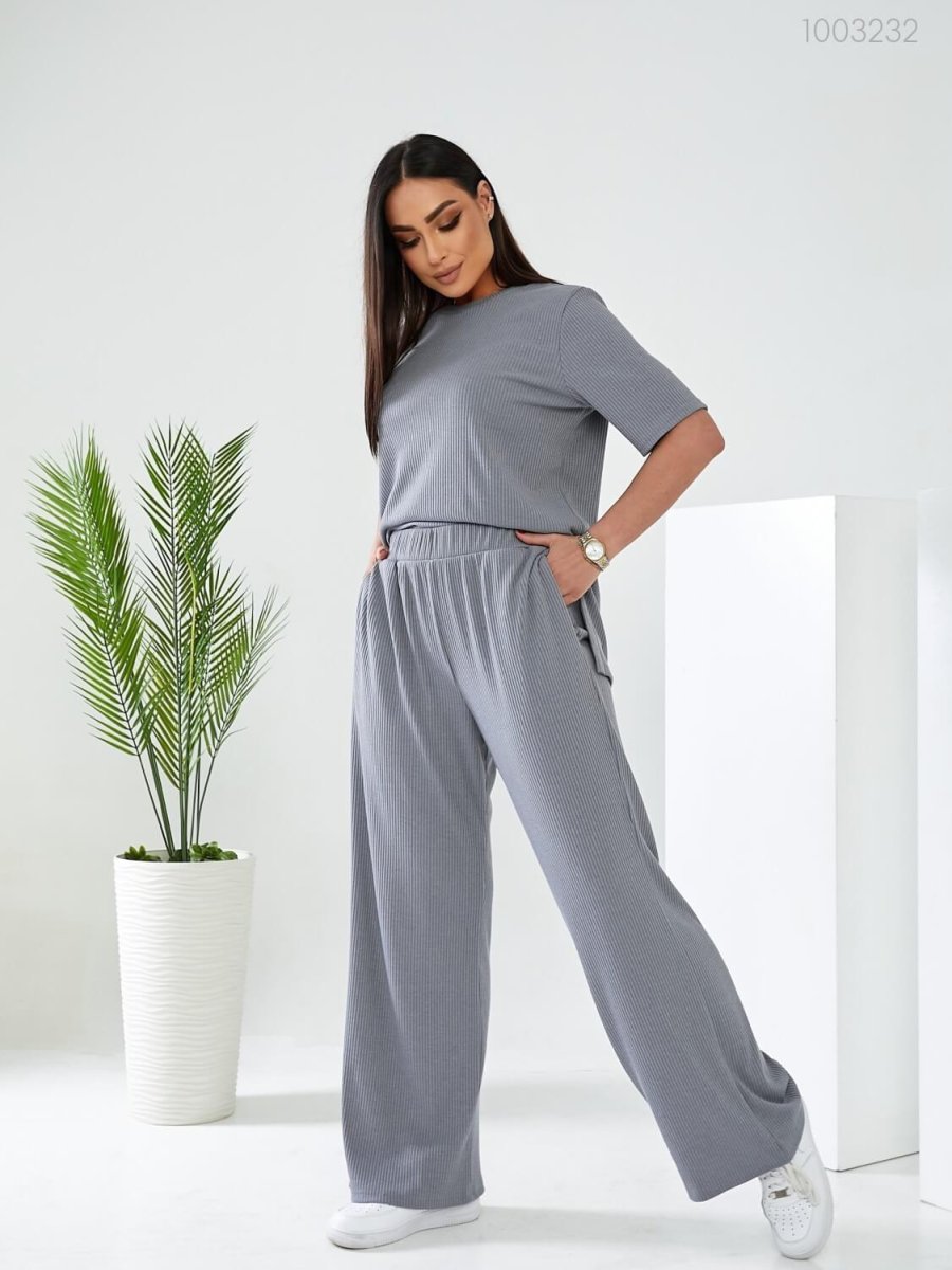 Деталі: довга футболка вільного крою з округлою горловиною та рукавом до ліктя. Штани-палаццо на широкій гумці, з глибокими кишенями.