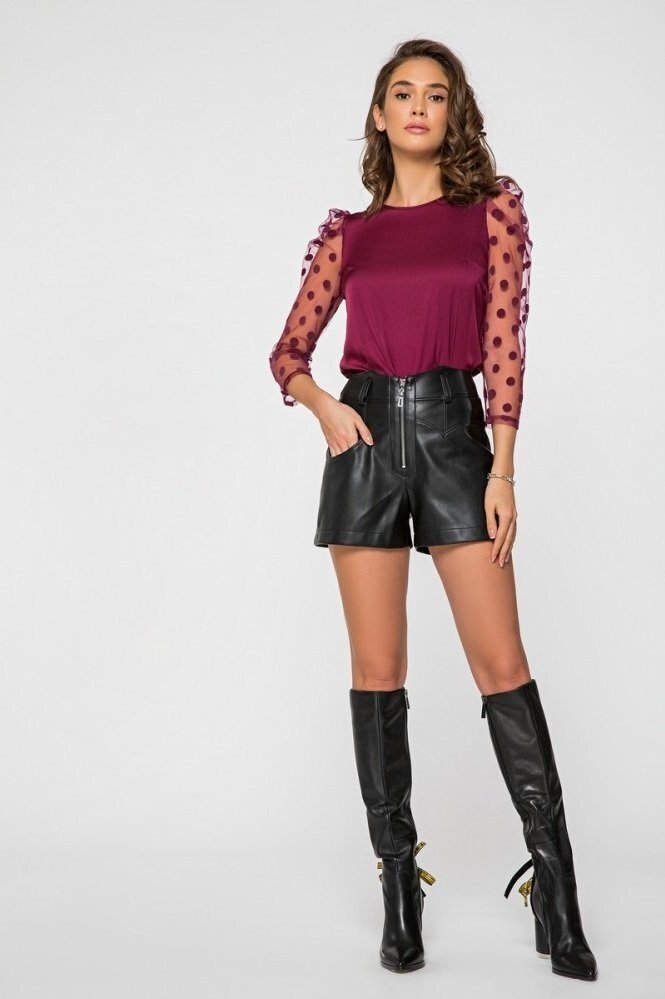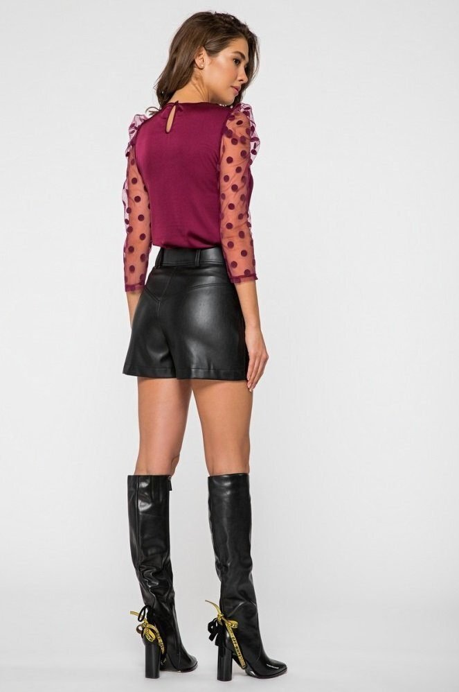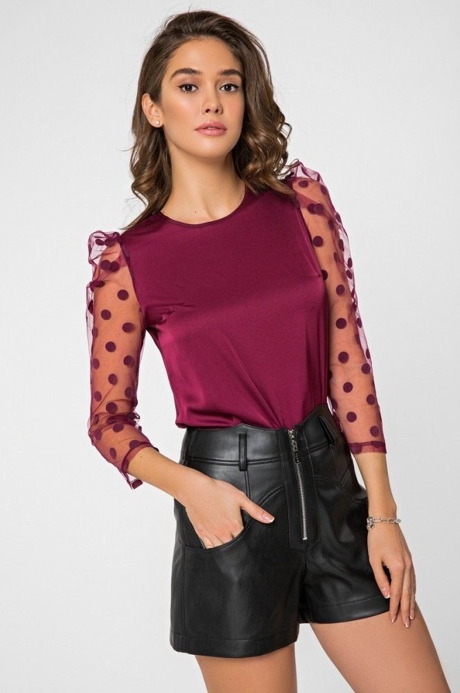 Шовкова блуза з коротким рукавом з стеки у великий горох. Зростання моделі 175 див.