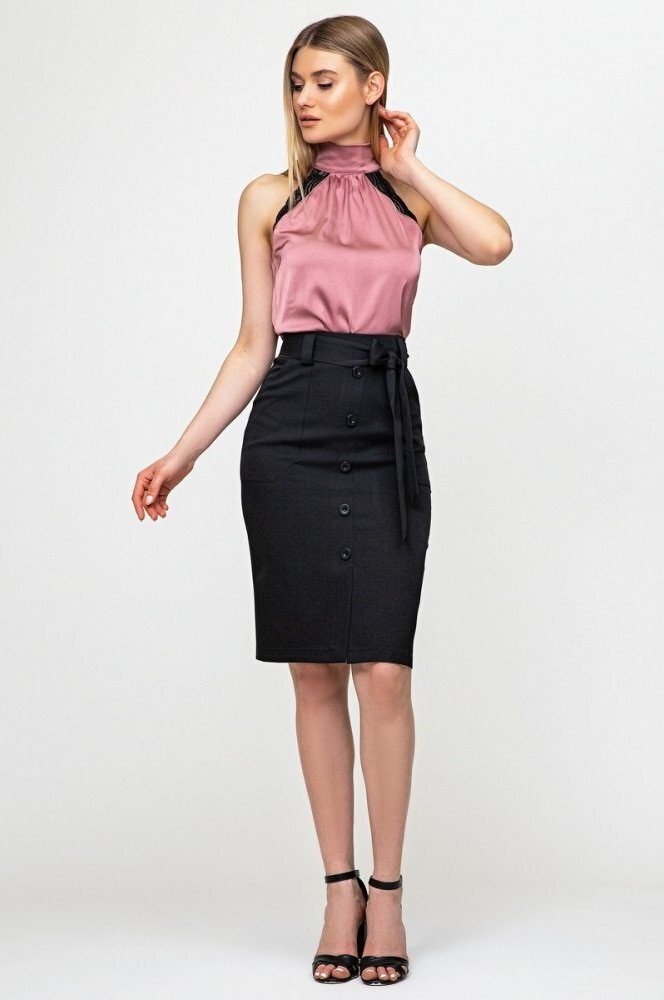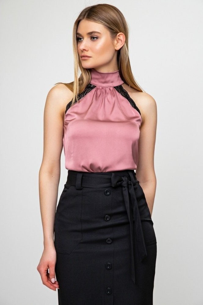 Шовкова блуза з високим коміром, прикрашена ніжним мереживом з боків, а ззаду зав'язується на бант.