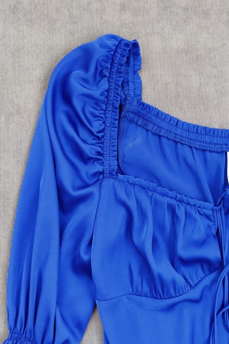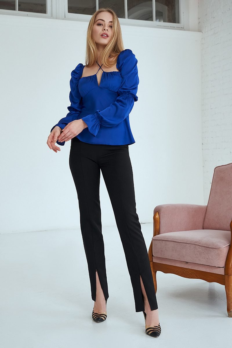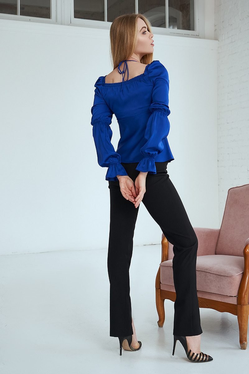 Шовкова блуза з вирізом каре, виріз виконаний на гумці. Модель декорована перехресними тонкими бретелями які зав'язуються ззаду на шиї. Об'ємні рукава надають блузі романтичності і легкості. Без застібок. Модель ідеально підходить для особливого випадку – побачення, вечірки або виходу в світ.