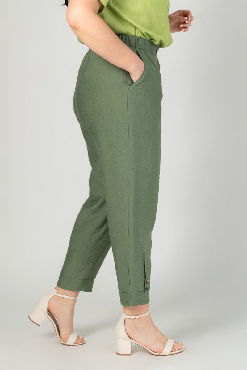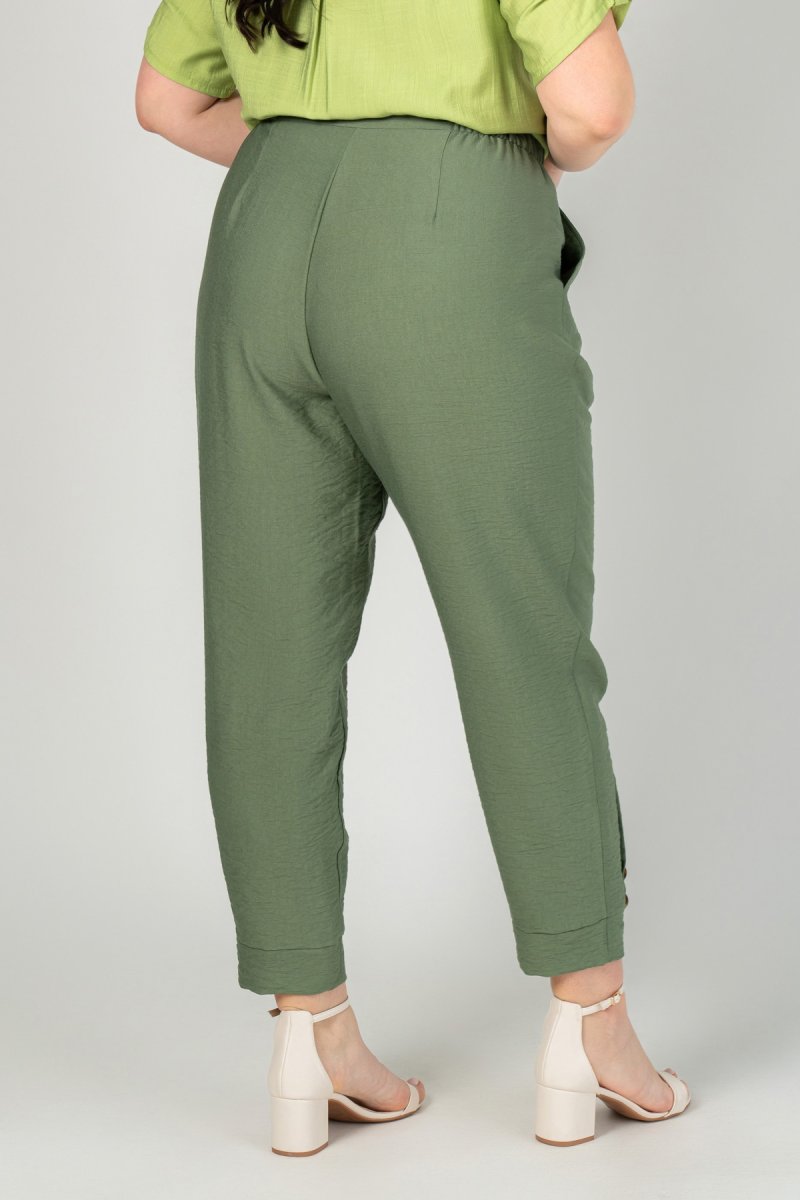 Штани з високою посадкою, звужені внизу за допомогою защипу та манжету, декоровані ґудзиками. З боків у пояс вставлена резинка (розтяжність 5-7 см). На передній частині штанів виконані кишені. Застібка - гульфік на блискавці, пояс застібається на петлю з ґудзиком. Виконані із жатого льону, розтяжність тканини низька.