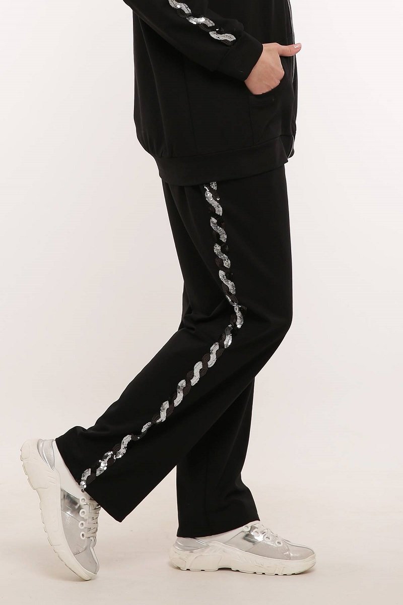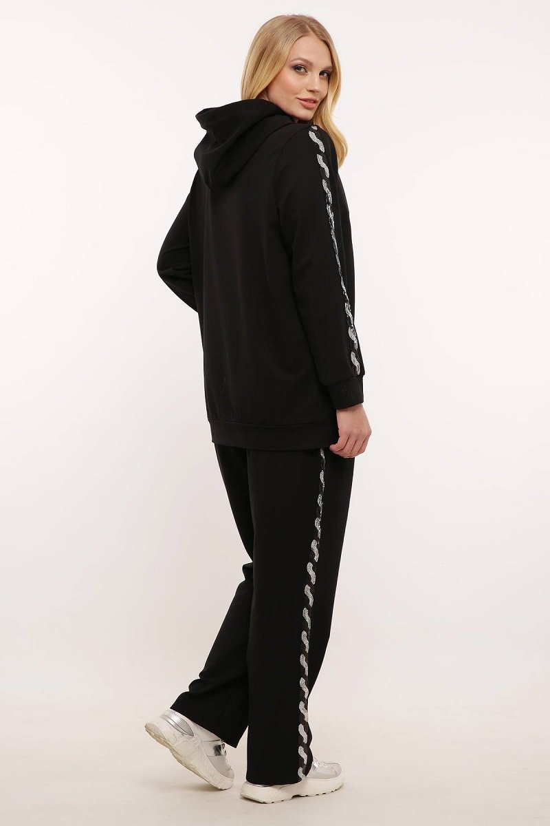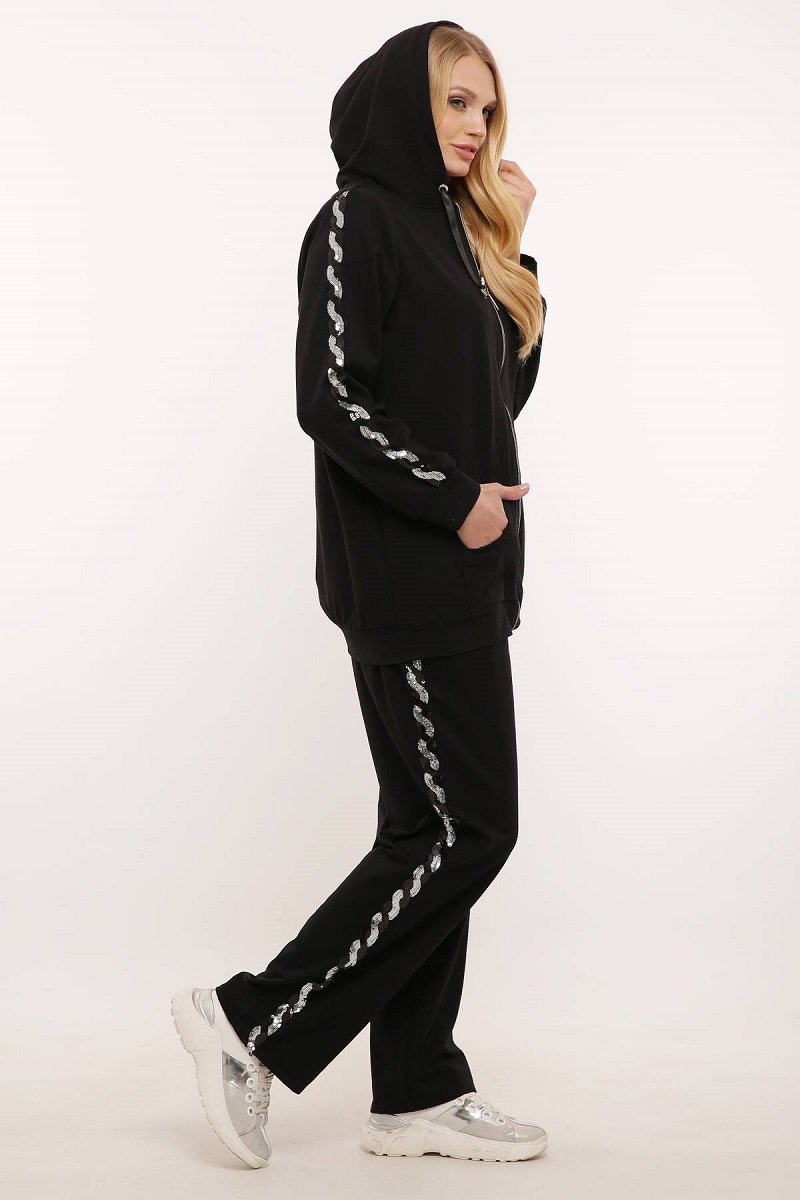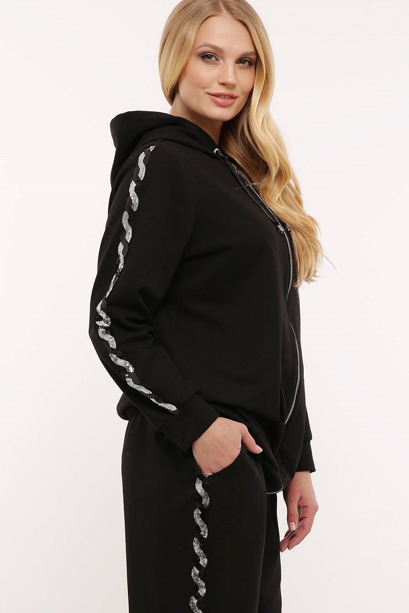 Класичний спортивний костюм з капюшоном, виконанню з бавовняного трикотажу. Кофта застібається на блискавку. По низу кофти і рукава широка "гумка" і манжети з основної тканини. Кишені "кенгуру". Штани прямі на гумці на талії з косими втачнимі кишенями. По центру рукава і боковому шву штанів - декоративні лампаси з паєтками.