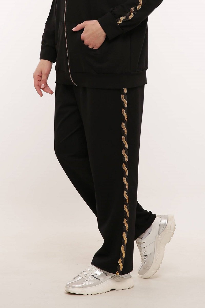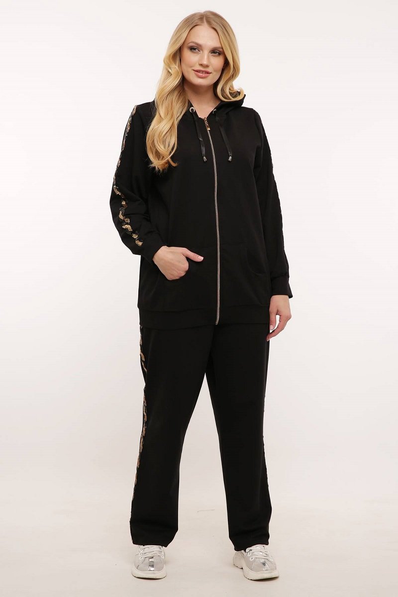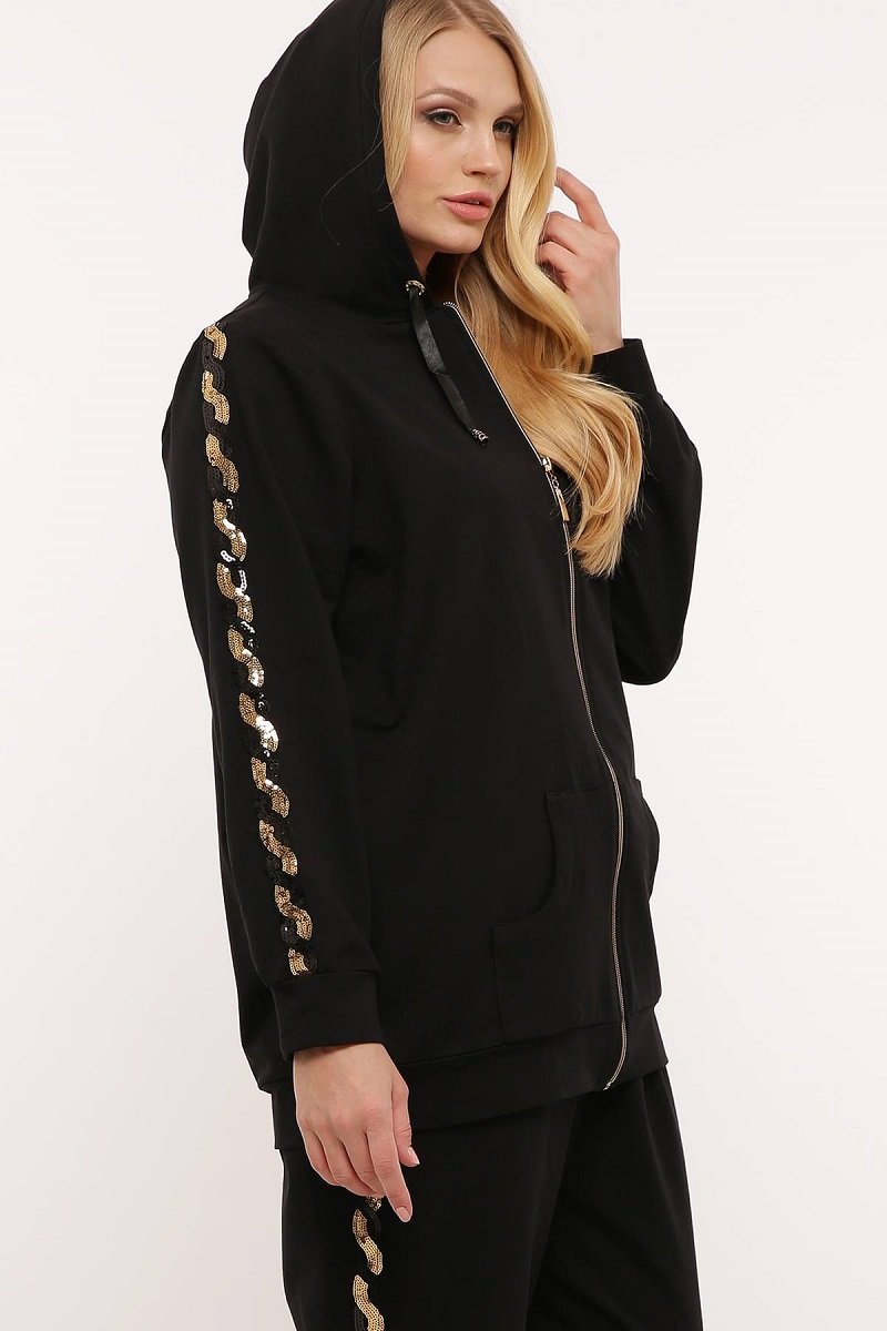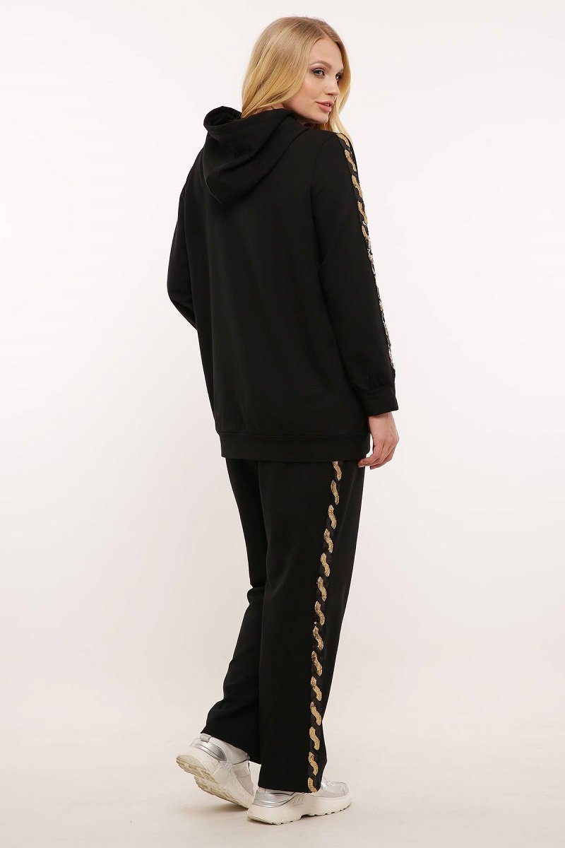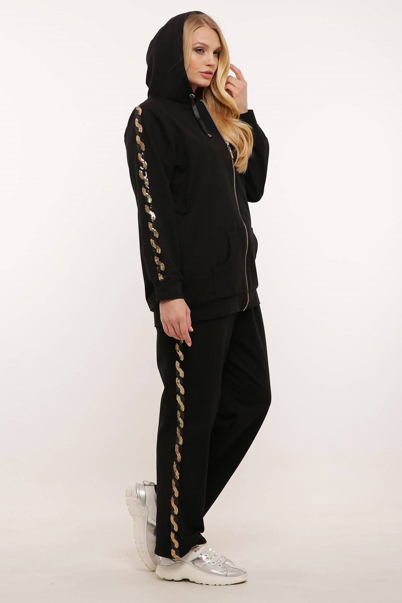 Класичний спортивний костюм з капюшоном, виконанню з бавовняного трикотажу. Кофта застібається на блискавку. По низу кофти і рукава широка "гумка" і манжети з основної тканини. Кишені "кенгуру". Штани прямі на гумці на талії з косими втачнимі кишенями. По центру рукава і боковому шву штанів - декоративні лампаси з паєтками.