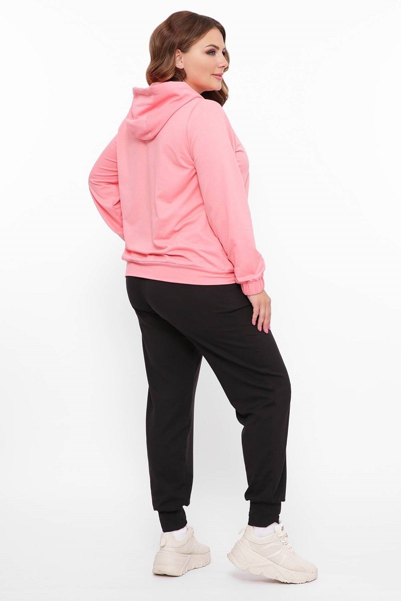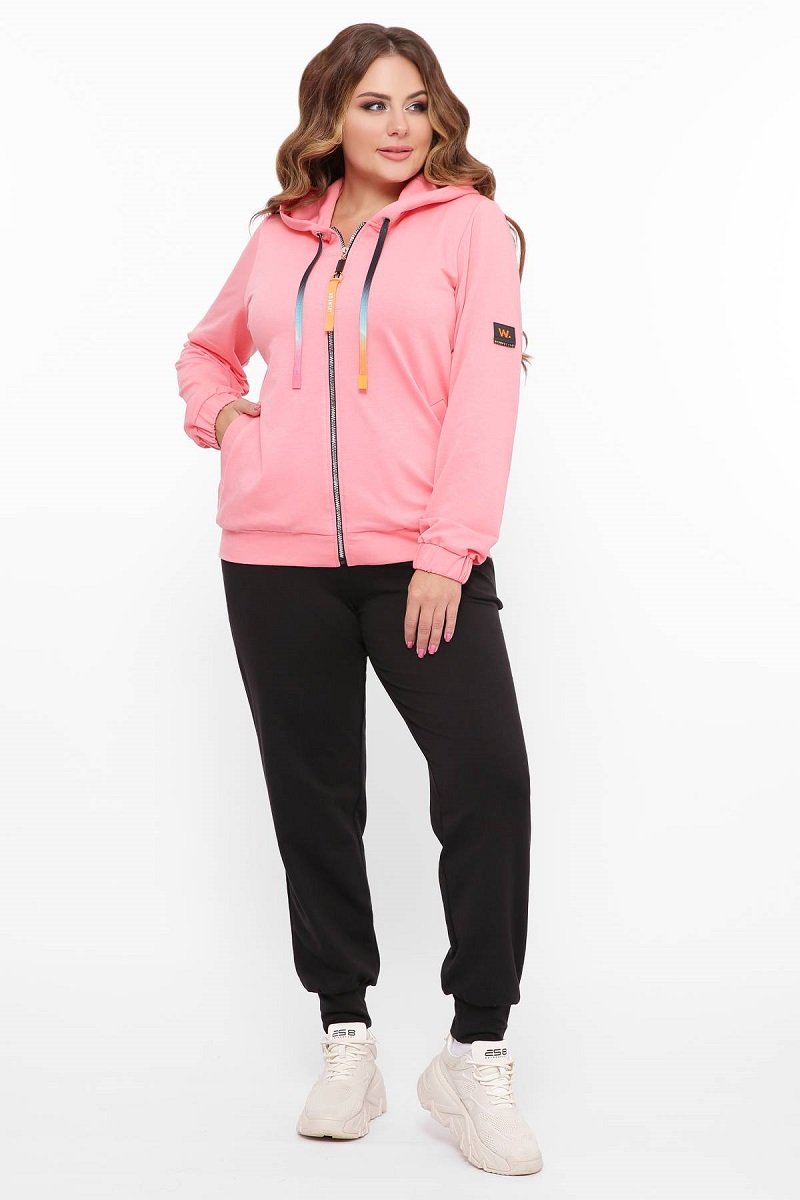 Спортивний костюм з капюшоном, виконанню з тканини (двунитка) - яскравий верх і чорні брюки. Кофта застібається на блискавку. По низу кофти, брюк і рукава широка "гумка" (манжети з основної тканини). На поличках косі вшівние кишені. Штани завужені до низу з косими втачнимі кишенями. На талії резинка.