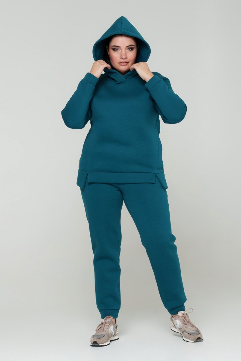 Джемпер прямого силуету з капюшоном. Рукав втачний на спущеній проймі. Низ джемпера з притачною планкою та розрізами. У бокових швах кишені. Штани з високою посадкою на еластичному поясі, попереду кишені, по низу - відрізний манжет.