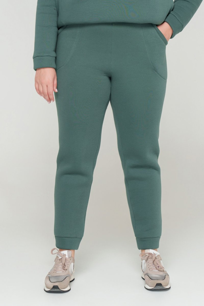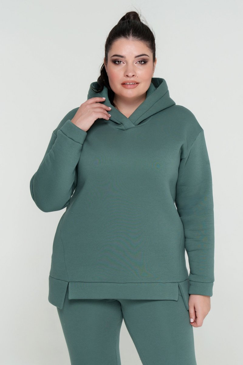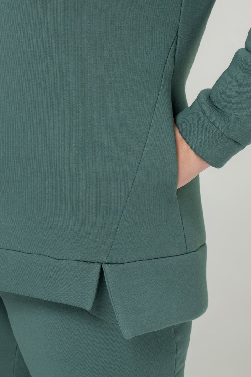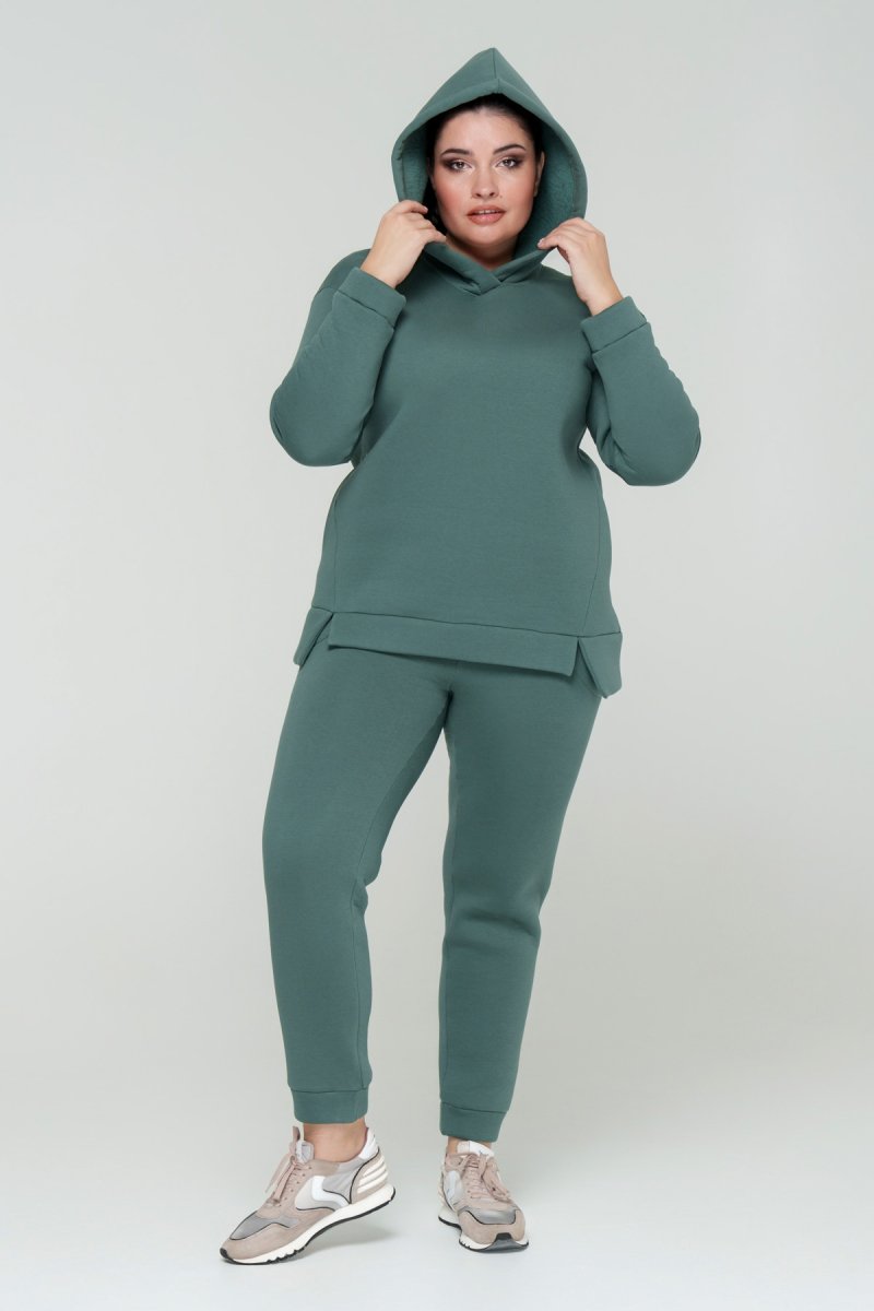 Джемпер прямого силуету з капюшоном. Рукав втачний на спущеній проймі. Низ джемпера з притачною планкою та розрізами. У бокових швах кишені. Штани з високою посадкою на еластичному поясі, попереду кишені, по низу - відрізний манжет.