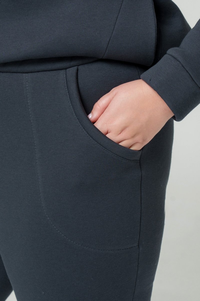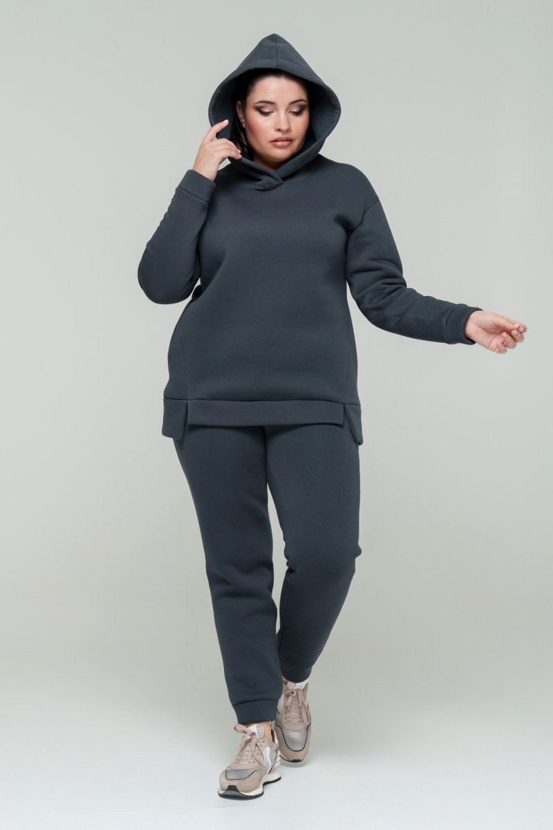 Джемпер прямого силуету з капюшоном. Рукав втачний на спущеній проймі. Низ джемпера з притачною планкою та розрізами. У бокових швах кишені. Штани з високою посадкою на еластичному поясі, попереду кишені, по низу - відрізний манжет.