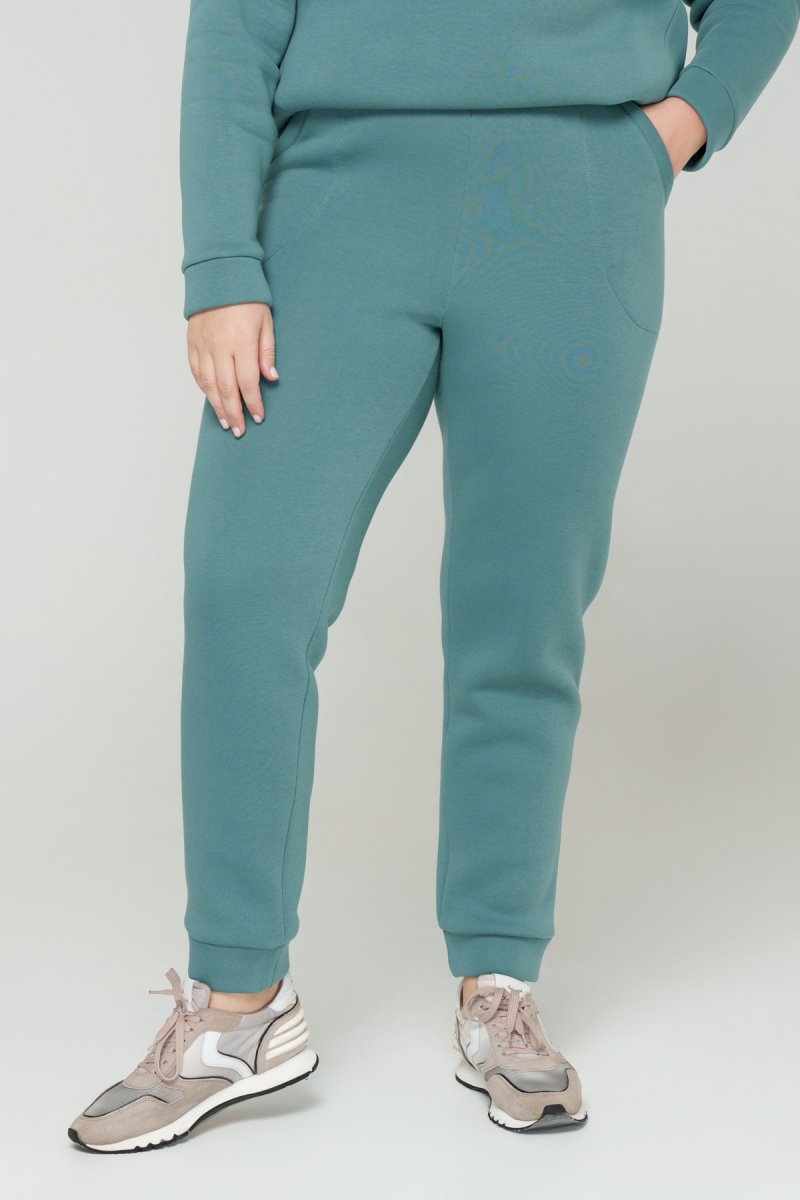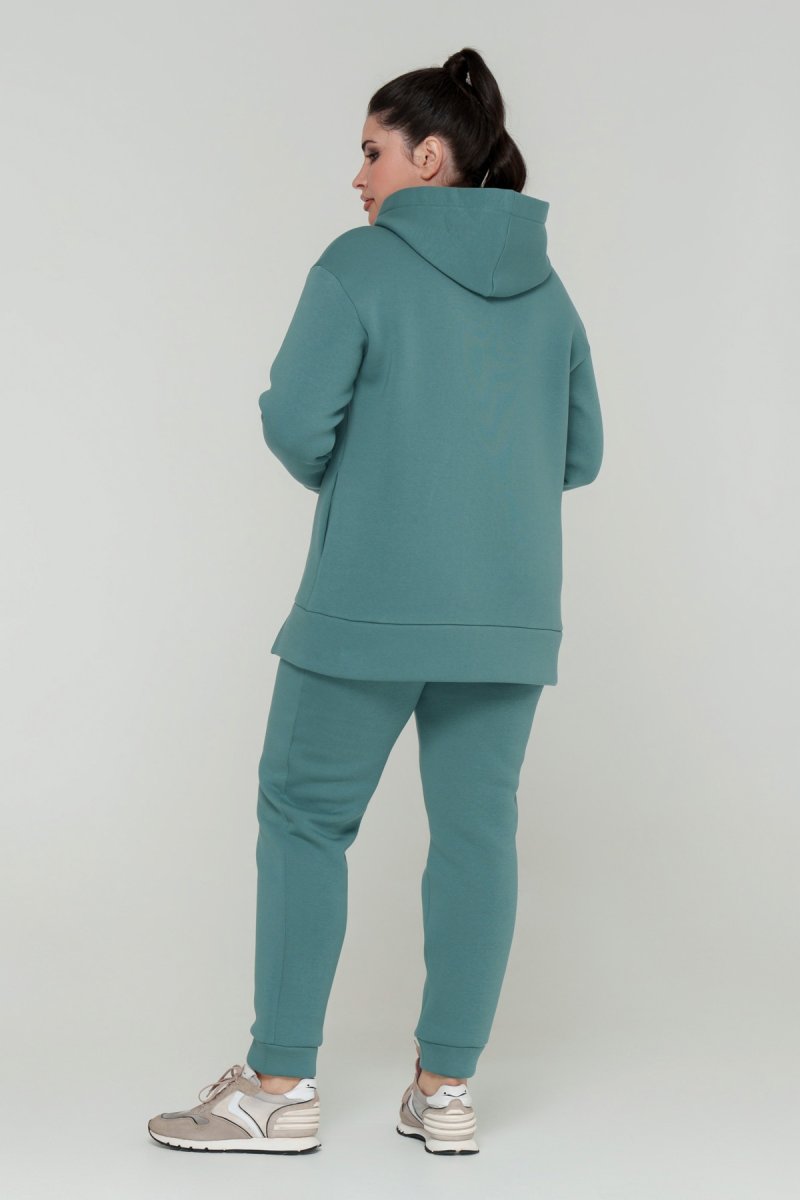 Джемпер прямого силуету з капюшоном. Рукав втачний на спущеній проймі. Низ джемпера з притачною планкою та розрізами. У бокових швах кишені. Штани з високою посадкою на еластичному поясі, попереду кишені, по низу - відрізний манжет.