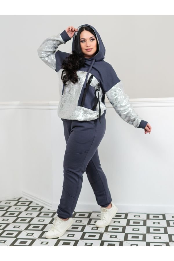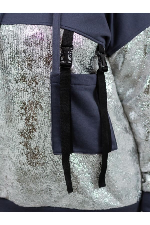 Толстовка вільного крою з капюшоном, регульованим зав'язками на люверсах. Поличка і рукава виконані з футера з сріблястим напиленням. На поличці накладна кишеня, декорована стрічками з фастексами. На рукавах і по кромці виробу-манжети.