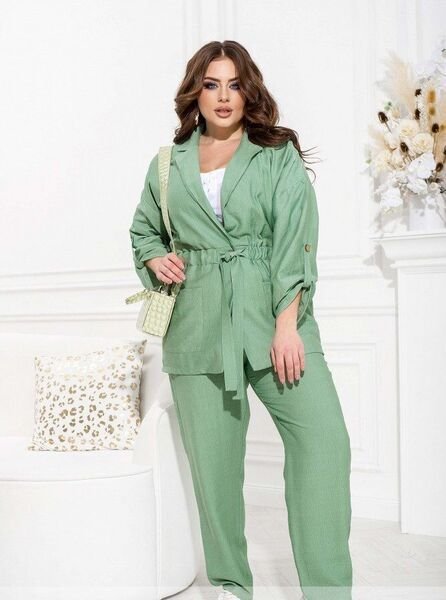 Стильний монохромний костюм – ідеальний варіант для теплої весни та спекотного літа. У комплект входять лаконічні штани на резинці з кишенями та блуза на зав'язках та резинці, вшитій по лінії таліі, виконана в формі жакета з коміром.