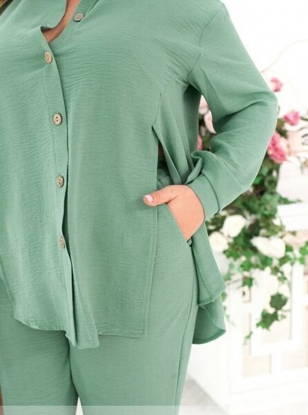 У комплект входять лаконічні штани на резинці з кишенями і виразна блуза в тон, що доповнена відкладним коміром, довгими рукавами з манжетами і функціональними гудзиками спереду на планці. Родзинкою цієї блузи є розрізи з боків спереду, що розпахуються і роблять її ще більш повітряної і невагомою.