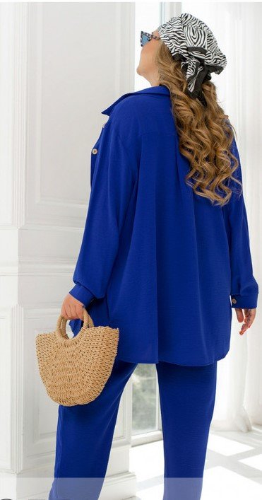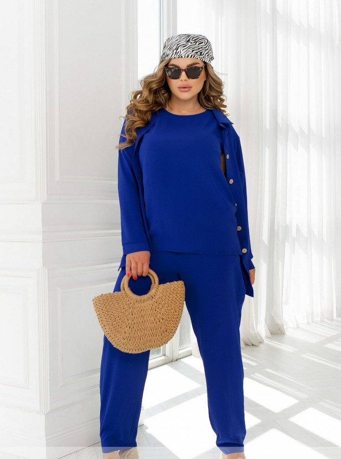 Елегантний та стильний костюм трійка великого розміру. Верхня сорочка подовжена, з відкладним комірцем, на грудях накладна кишеня, з боків - довгі розрізи. На рукавах манжети, на манжетах по одному гудзику. Брюки з високою талією, з боків - кишені в шві, до поясу вшито резинку. Майка з півкруглим вирізом горловини, на грудях виточки, з боків подолу - розрізи. Без кишень і застібок.