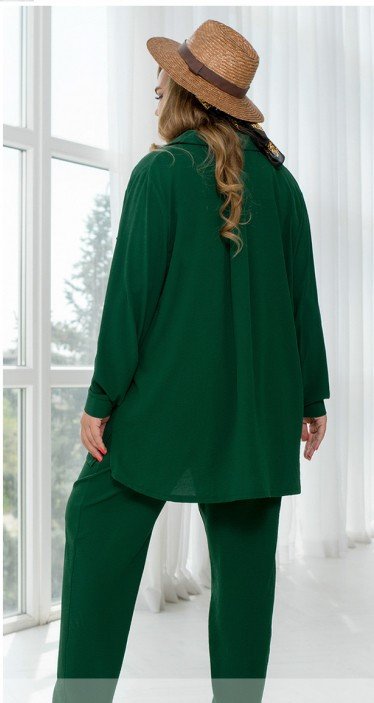 Елегантний та стильний костюм трійка великого розміру. Верхня сорочка подовжена, з відкладним комірцем, на грудях накладна кишеня, з боків - довгі розрізи. На рукавах манжети, на манжетах по одному гудзику. Брюки з високою талією, з боків - кишені в шві, до поясу вшито резинку. Майка з півкруглим вирізом горловини, на грудях виточки, з боків подолу - розрізи. Без кишень і застібок.