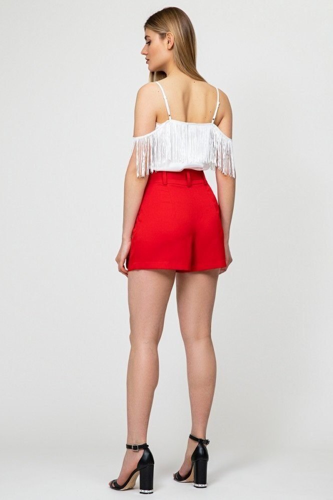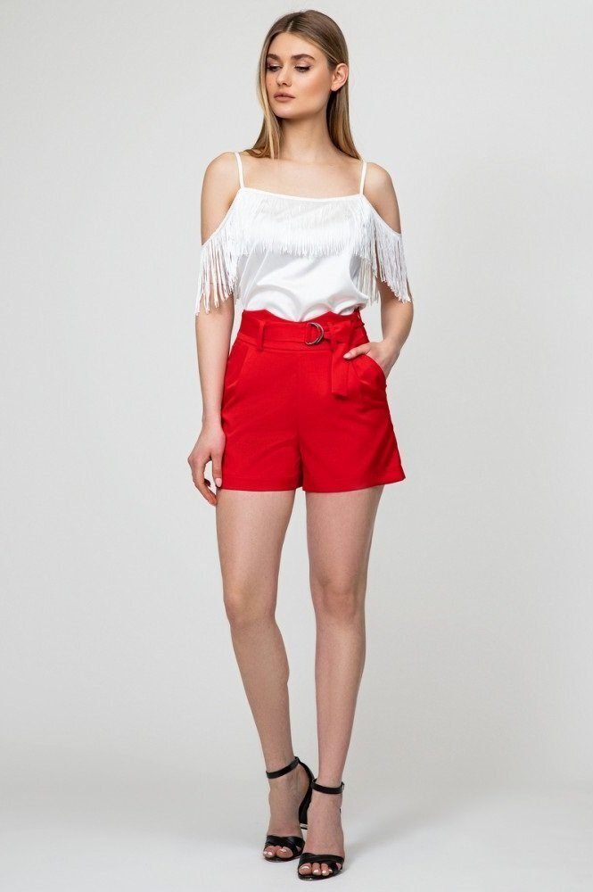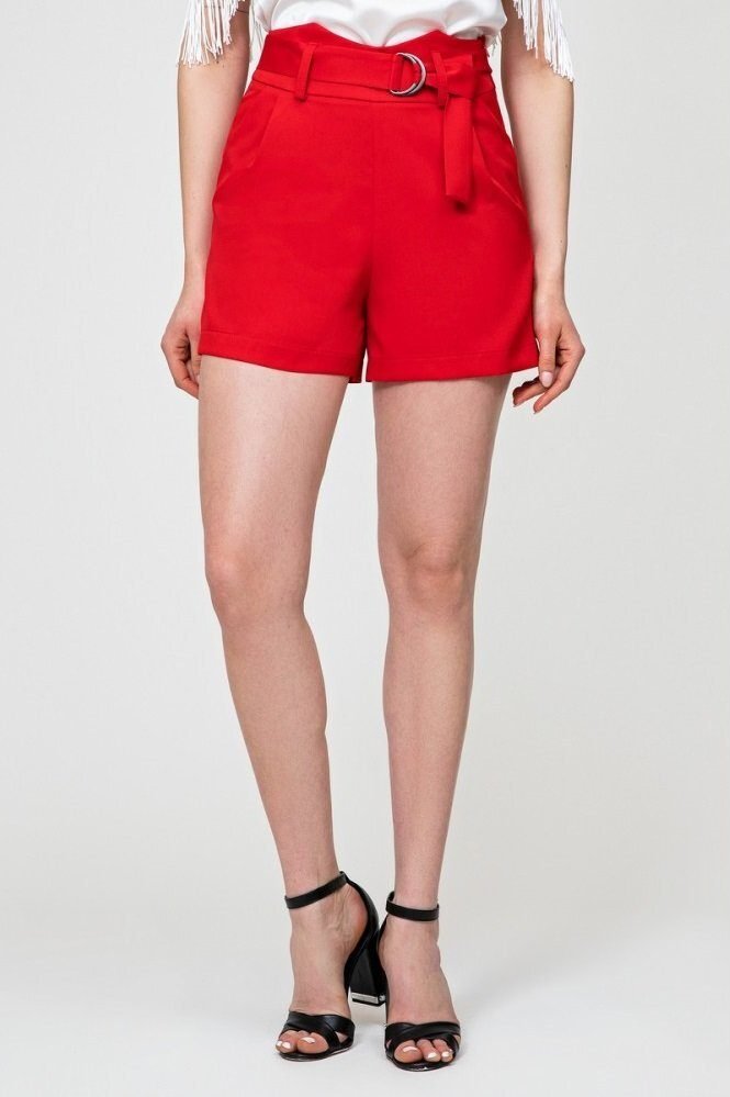 Стильні шорти з костюмної тканини з бічними кишенями. Застібаються на потаємну блискавку збоку, комплектуються поясом з основної тканини.