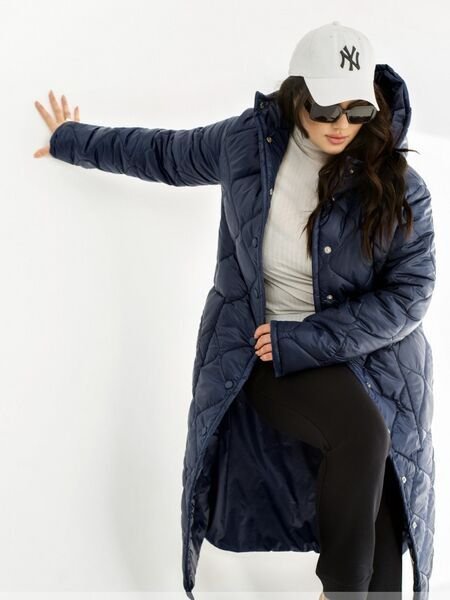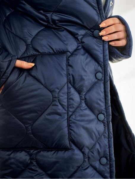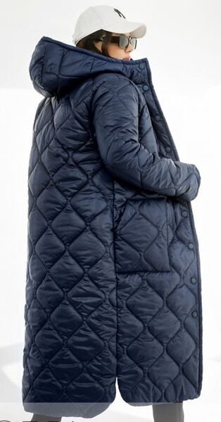 Довга стьобана куртка з пришивним капюшоном, високим коміром і довгими рукавами. Такий варіант курток майорить на стильних фешн показах вже другий рік та досі не втрачає своєї популярності. Куртка застібається на ряд кнопок спереду.