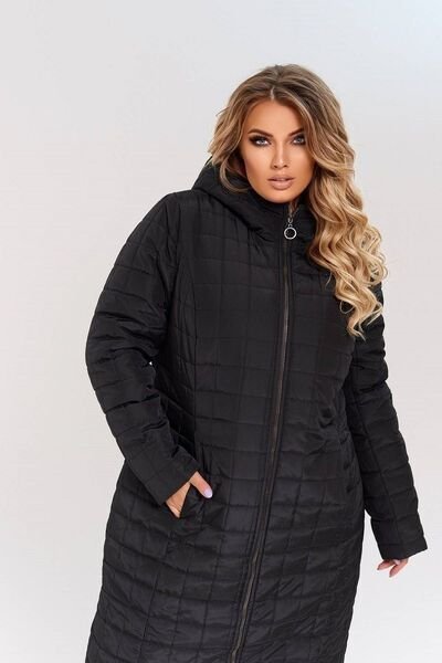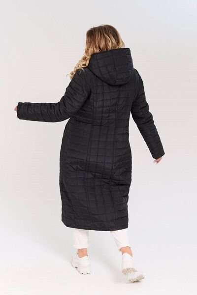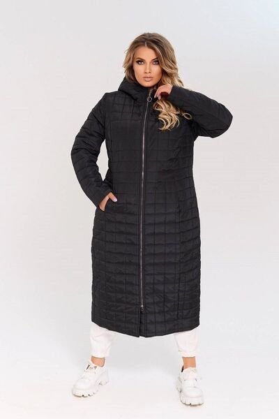 Довге стьобане пальто на силіконі. Силует трохи приталений. Пальто застібається на блискавку, в вертикальних рельєфах переду сховані кишені. Пальто доповнено функціональним зручним капюшоном.