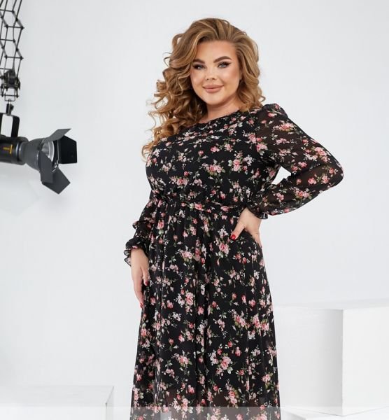 Яскрава сукня у квітковий принт, яка однозначне стане улюбленою в вашому гардеробі. Акцент ми зробили на відрізній талії з гумкою, яку можна доповнити текстильним пояском в тон. Довгі рукави прикрашені гумкою, а поділ трохи асиметричний. Сукня застібається по спинці на ґудзик.