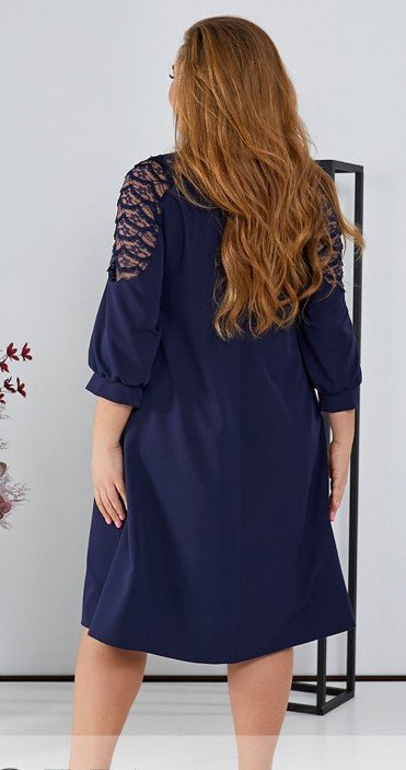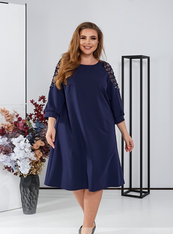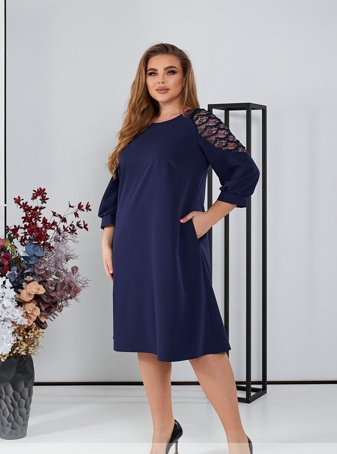Ця лаконічна монохромна сукня вражає своєю витонченістю. Вона має вишукані рукава довжини 3/4, прикрашені чарівним мереживом із декором на передплечі. Фасон трапеція надає сукні елегантний вигляд. Додатково вона доповнена кишенями по боках, що робить її практичною.