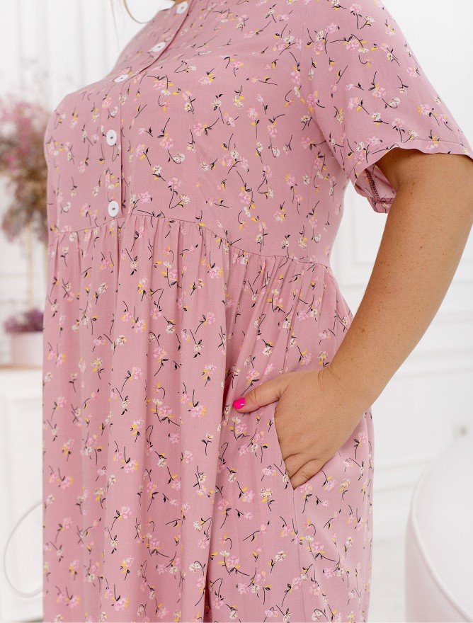 Ця ніжна сукня зроблена зі штапелю та прикрашена квітковим принтом, створюючи чарівний образ для літньої прогулянки. Модель сукні має завищену талію, що додає жіночності та підкреслює фігуру. Вона також прикрашена декоративними ґудзиками на планці, що додає додаткового акценту і стилізованого шарму до сукні.