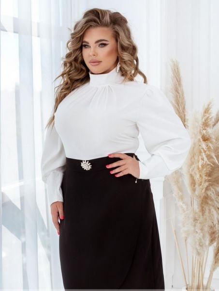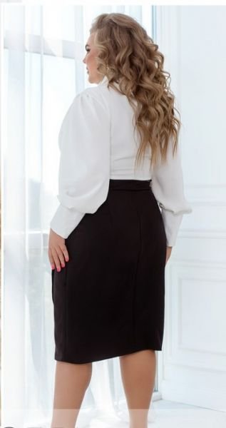 Рукава доповнені високим манжетом, а також ми при зібрали тканину на плечовому шві, що надає сукні вишуканості та ошатності. Виріб застібається на бокову потаємну блискавку та на два ґудзики на шиї. Чудовий варіант як для ділової зустрічі чи офісу, так і для важливого заходу.
