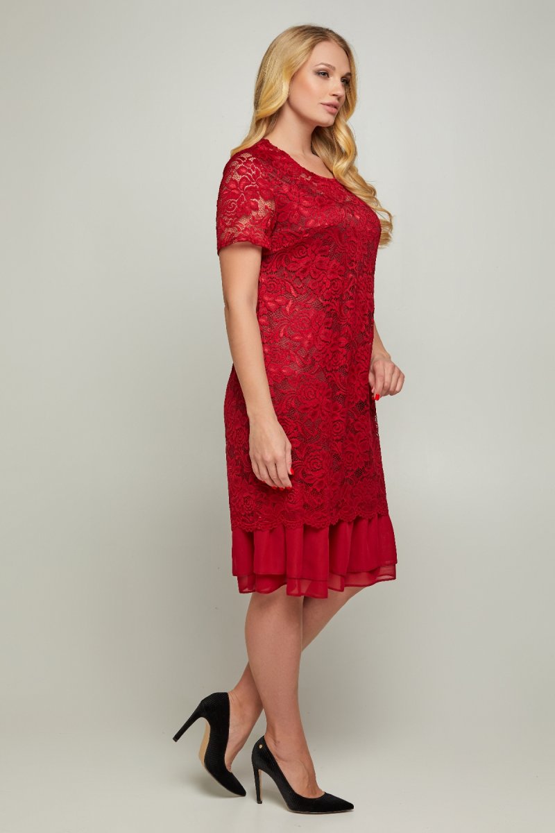 Святкова сукня із гіпюру. Підкладка із тканини трикотаж масло. Рукав короткий втачний одношовний. Родзинка моделі - шифонова рюша по низу. Гармонічно виглядає із взуттям на танкетці та підборах.