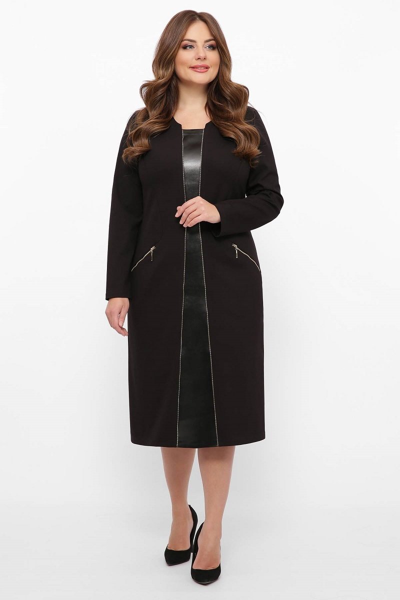 Лаконічна сукня трохи приталеного силуету з оригінальною вставкою зі штучної шкіри по переду вироба. Край вставки декоровано металевою блискавкою. По зігнутим рельєфам переду вшиті косі кишені на блискавці. Рукав втачний, трохи звужений.