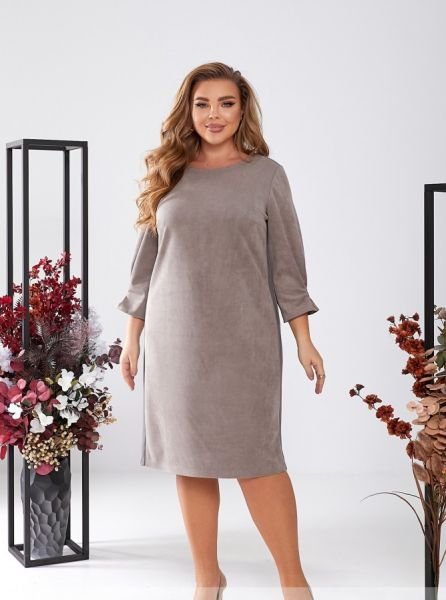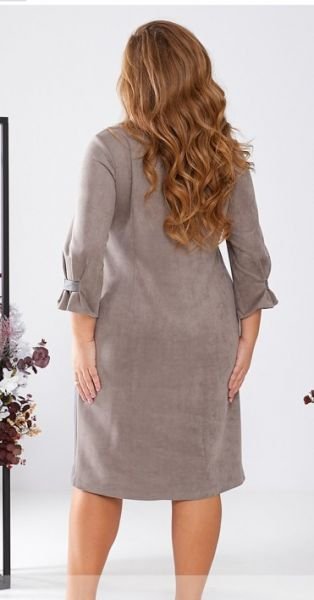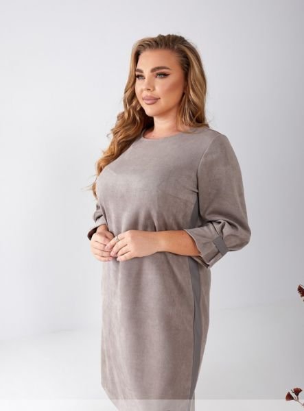 Монохромна стильна сукня-футляр, що виконана з м'якої замшевої тканини, підійде для прогулянок і зустрічей з друзями, шопінгу та вечірки. Родзинкою цієї лаконічної моделі є лампаси з екошкіри, вшиті по бічних швах, і рукава 3/4 без манжет, підшиті складками, що створюють додатковий об'єм.
