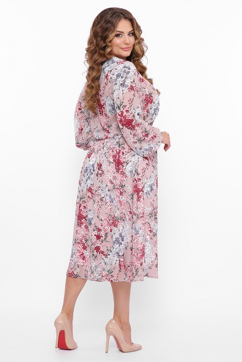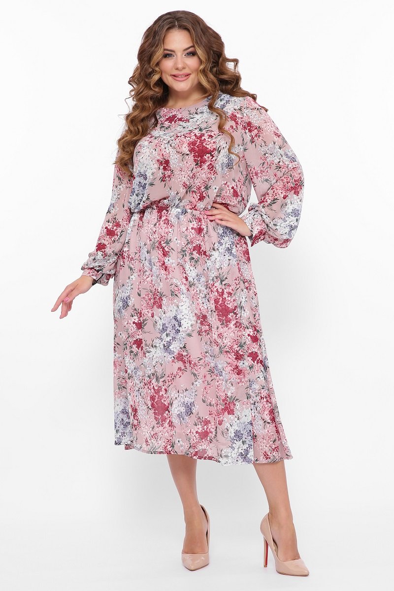 Літнє плаття середньої довжини з красивими широкими рукавами під манжети. Виріз горловини круглий. Спідниця трохи розкльошена з под'юбніком, на поясі гумка. Гарний квітковий принт доповнює крій і робить плаття досить ошатним.
