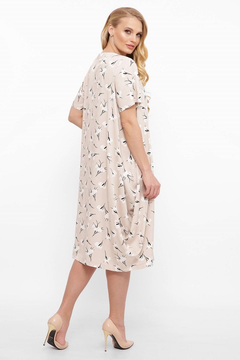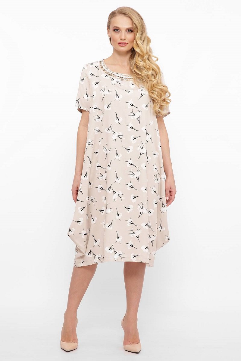 Літнє плаття середньої довжини А-образного вільного силуету, який створюється за рахунок широких фалд з боків. На круглої горловини переду красивий декоративний елемент у вигляді переплетення золотистих ланцюжків. Рукав короткий.