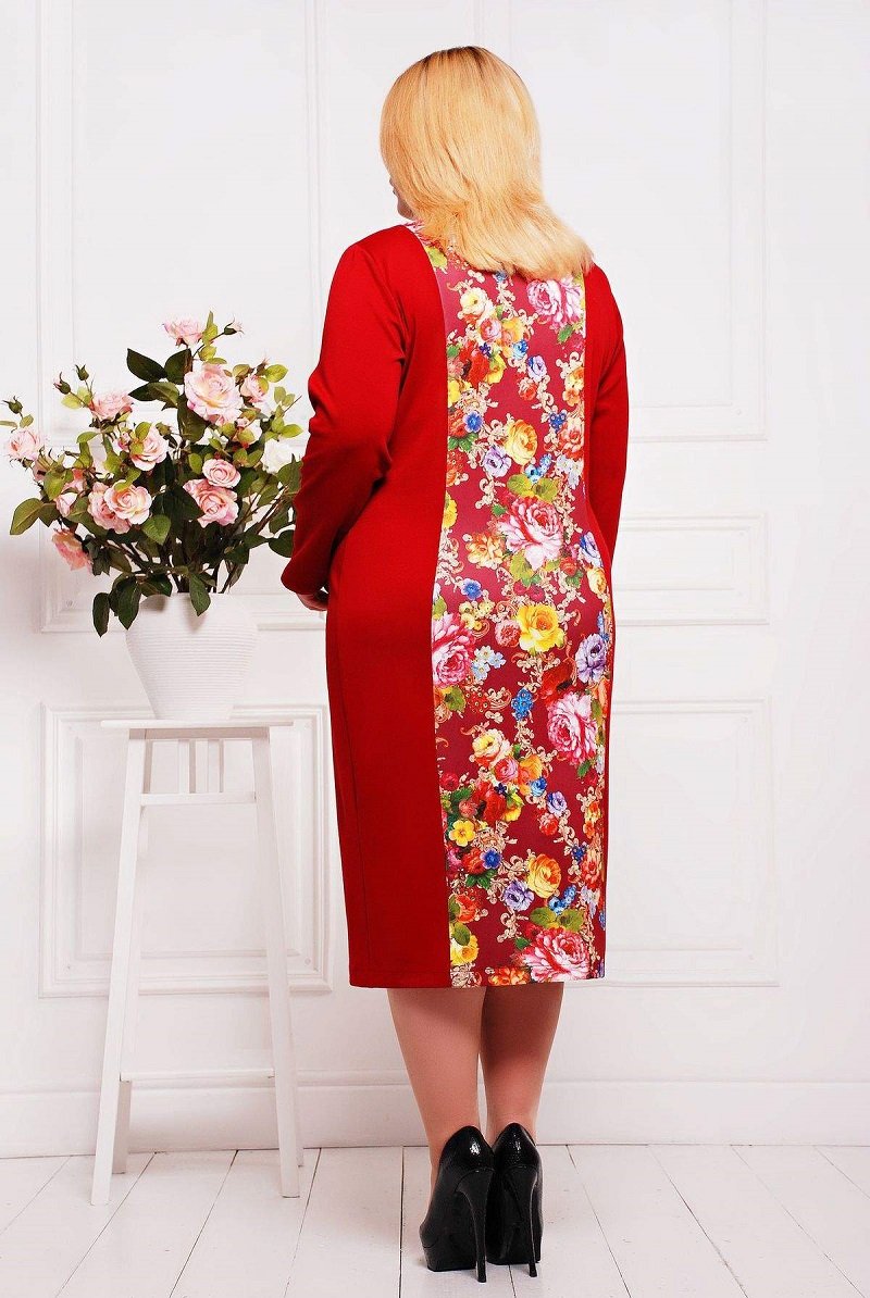 Сукня з однотонного дайвінгу з вертикальним декором, виконана у вигляді смуг з кольорового матеріалу з принтом "троянди". Візуально струнить за рахунок вдалого крою та зонування яскравих деталей. Кругла горловина, довгий рукав та середня довжина - класичне виконання та актуальний дизайн.