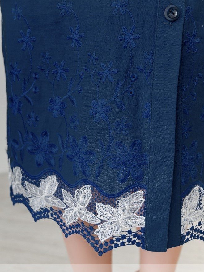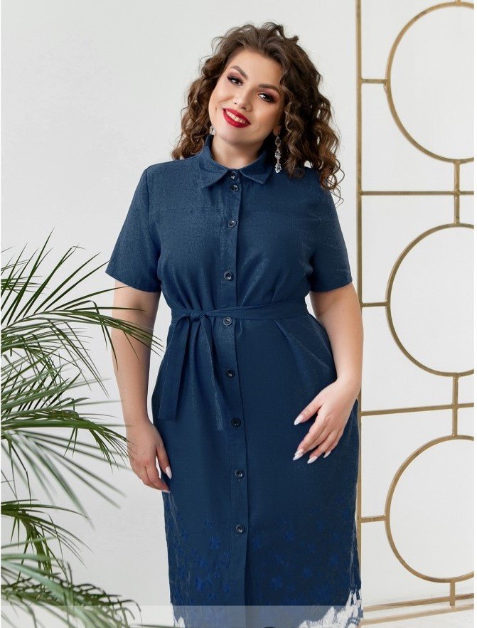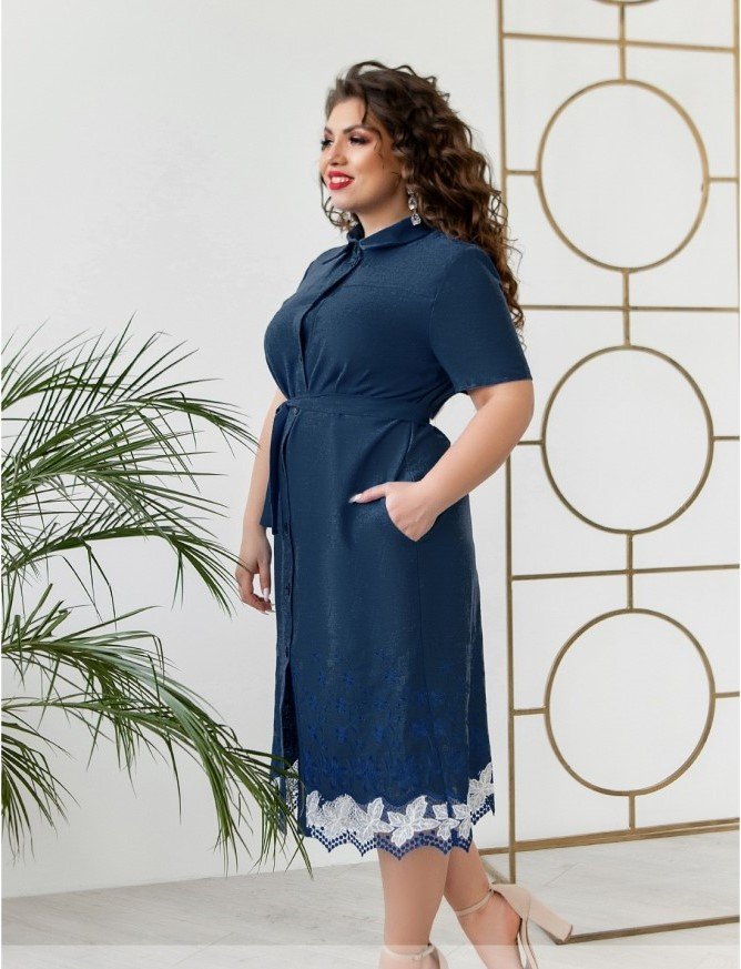 Мінімалістична й елегантна сукня-сорочка з пояском, застібається на низку гудзиків спереду на планці. Комірець відкладний, рукава короткі, без манжетів. Силует приталений. З обох боків - прорізні кишені. Поділ прикрашено чарівною вишивкою та ніжним мереживом.