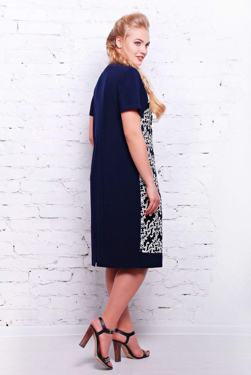 Пряма елегантна сукня з коротким рукавом, виготовлена з тонкого трикотажу "масло". У сукні скомбіновані тканини двох стилів – морського та романтичного рослинного візерунка під жаккард. Контрастна кокетка з білою поперечною смугою відволікає увагу від стегон та зорово зменшує їх обсяг. Рекомендується дівчатам та жінкам із вузькими плечима. Сукня чудово вписується у діловий офісний стиль.