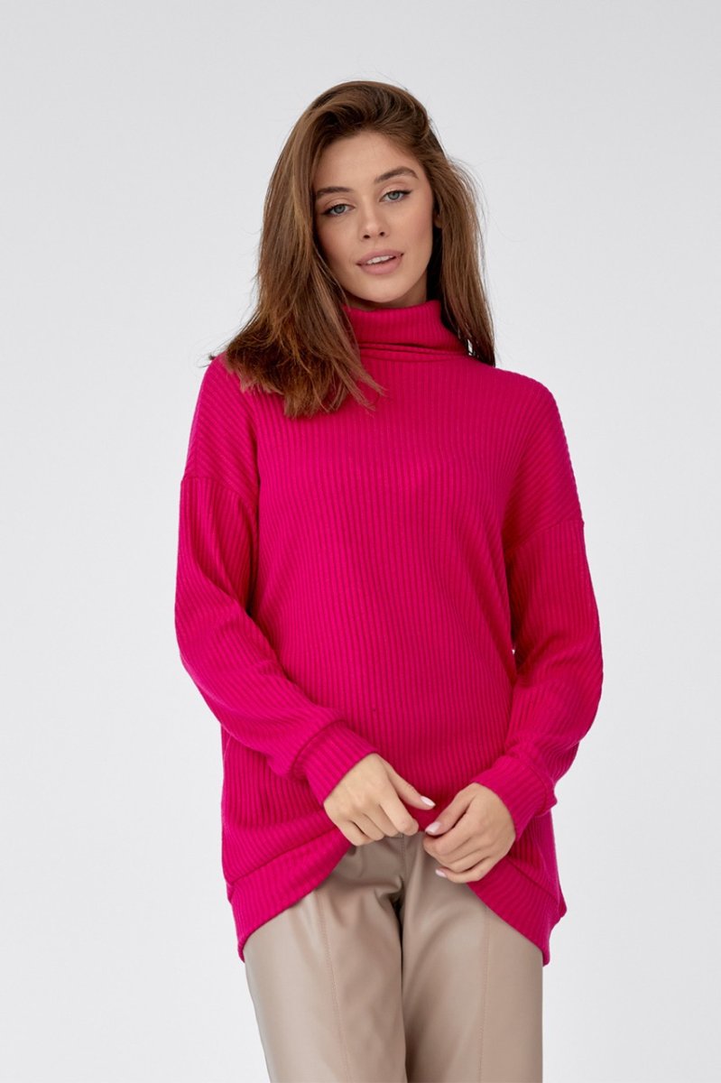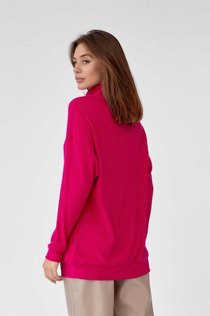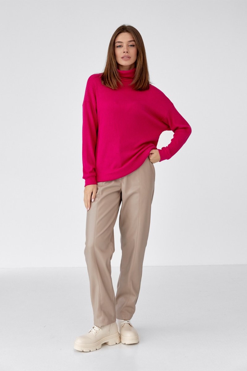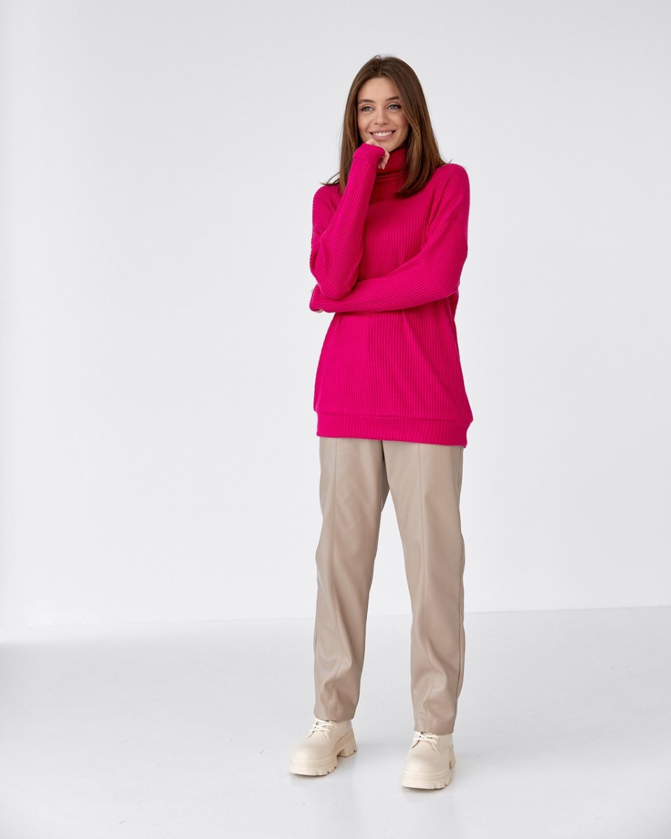 Теплий трикотажний светр із коміром хомут. Виріз горловини круглий. Рівень плеча приспущений, рукава втачні, довгі. По низу рукавів і виробу виконан манжет.