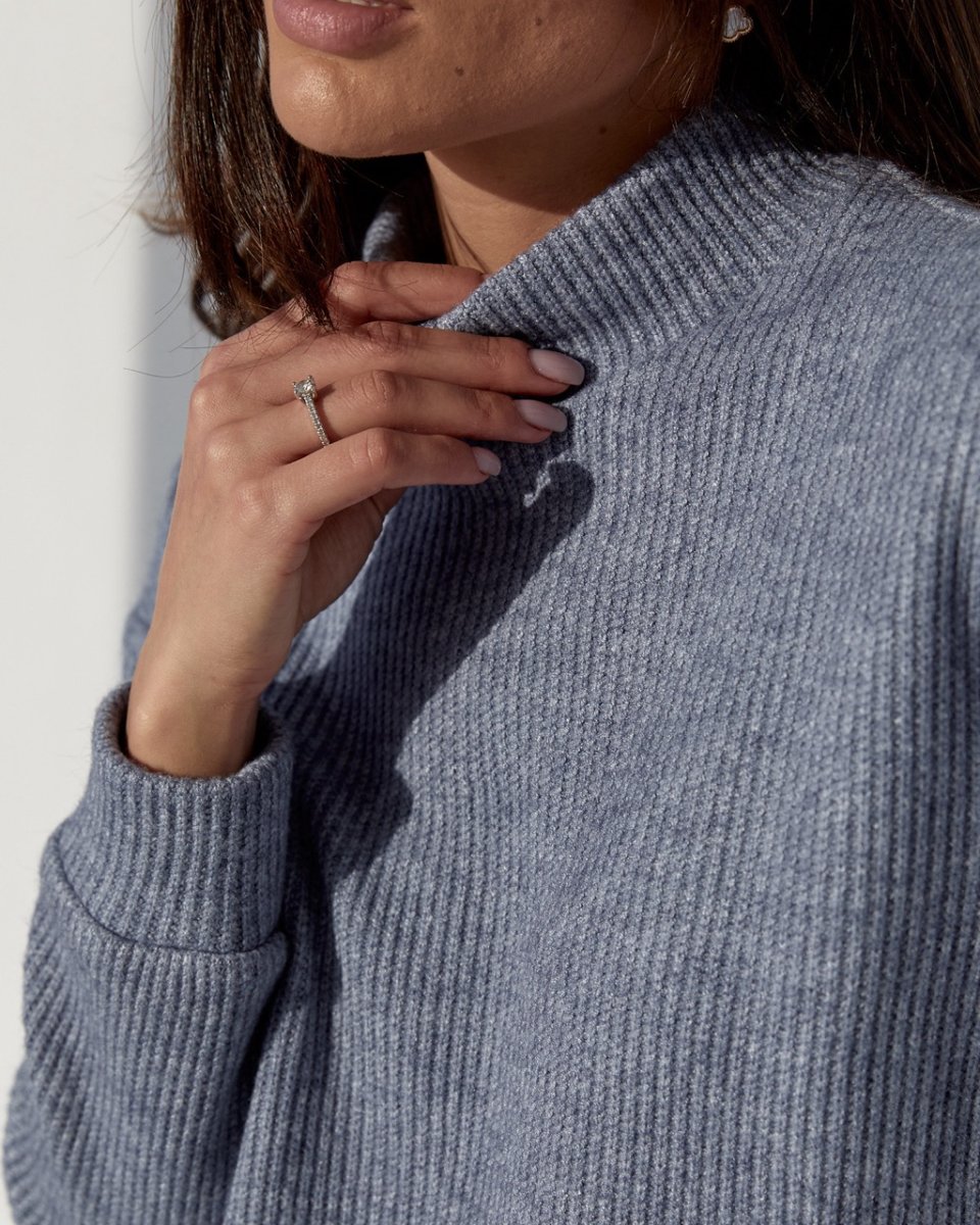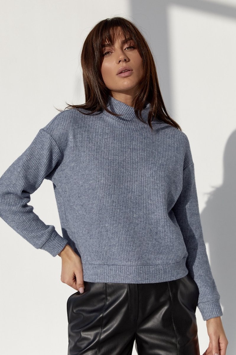 Теплий трикотажний светр із коміром - стійкою. Рівень плеча приспущений, рукава втачні, довгі, по низу рукавів і по низу виробу виконан манжет.