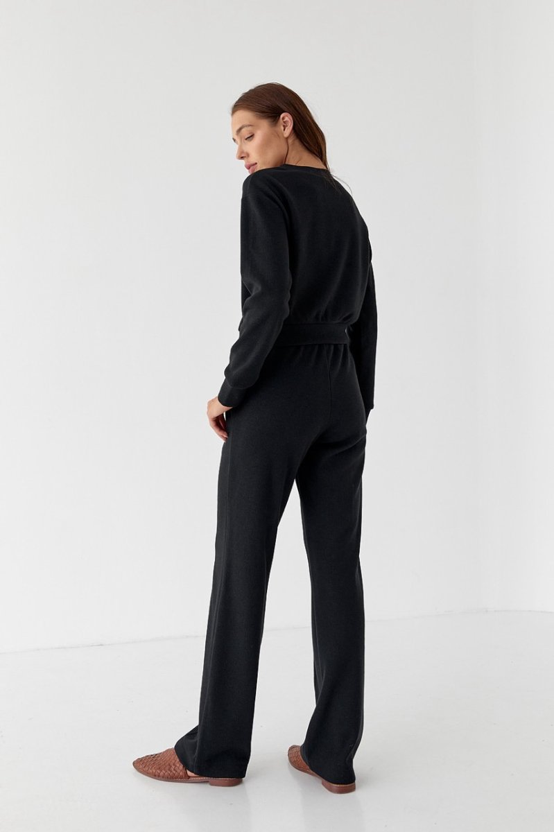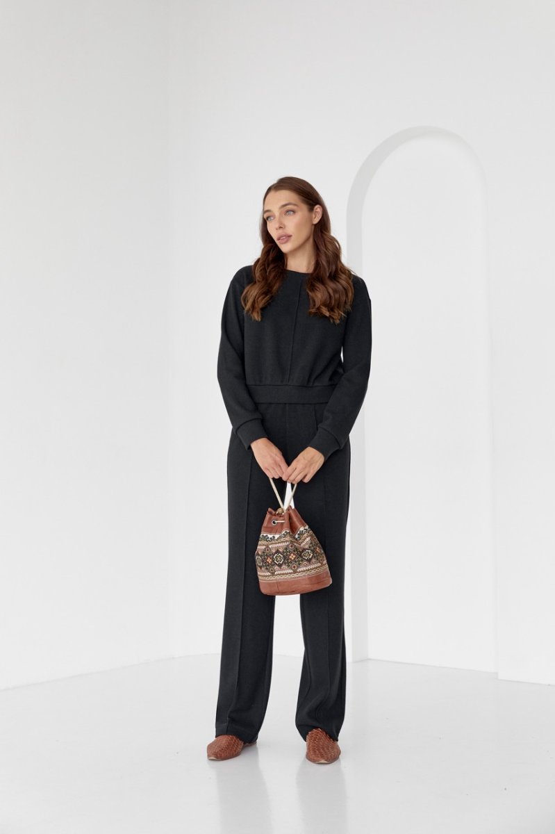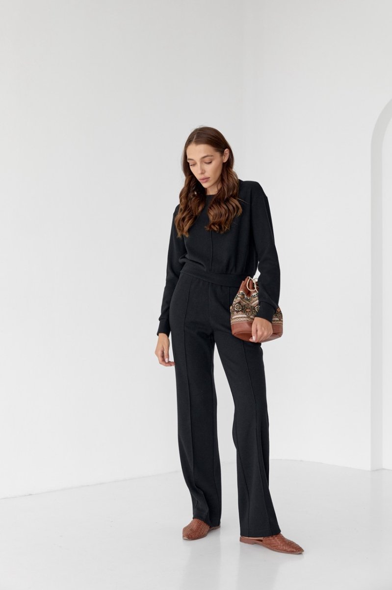 Теплий жіночій костюм з джемпера і штанів. Джемпер по низу з манжетом, спереді застрочений защіп. Виріз горловини круглий, з планочкою. Рівень плеча спущений, рукава вшивні, довгі, з манжетом по низу. Штани прямі, на талії пояс із резинкою. Кишені з відрізним бочком. Передні половинки зі стрілками, які зафіксовані строчкою.