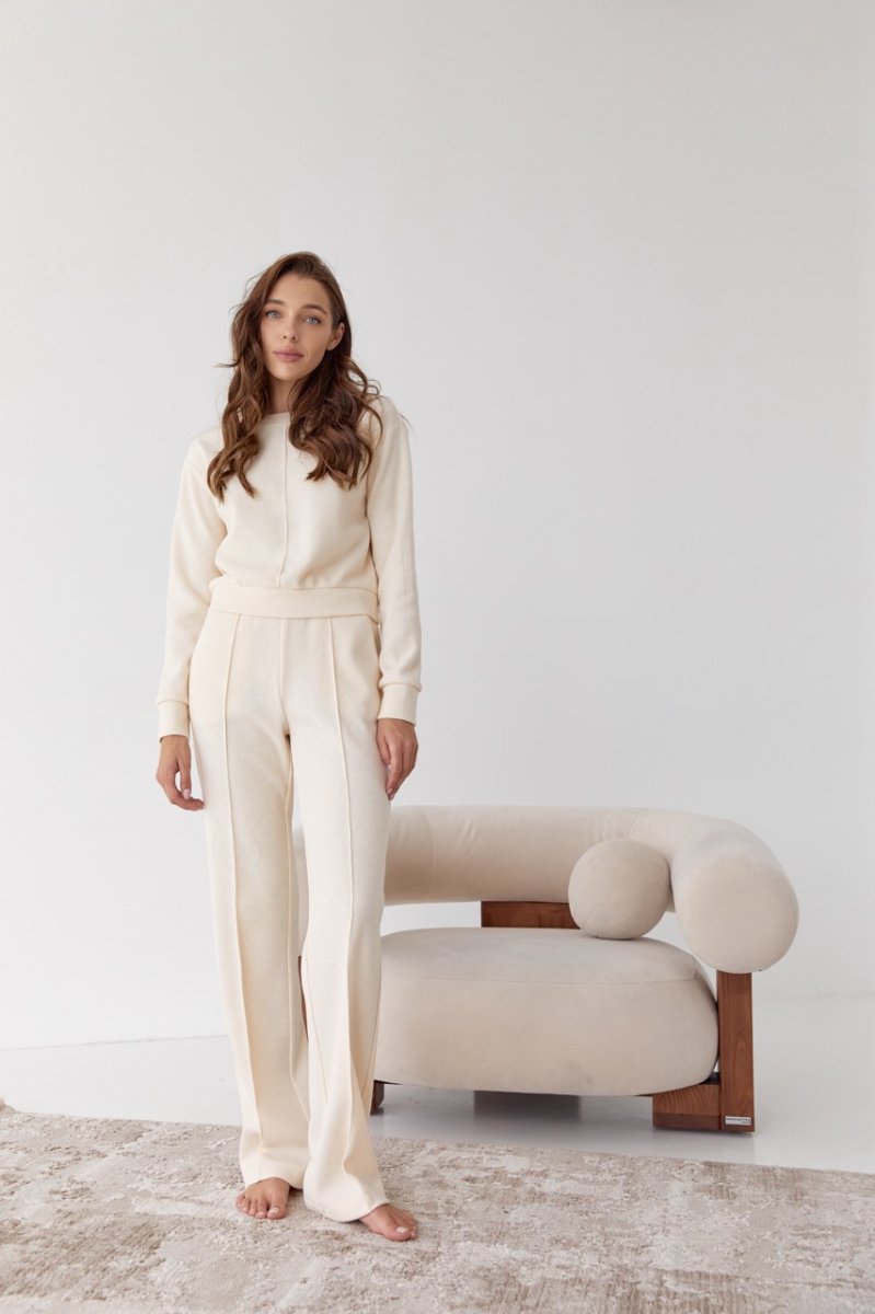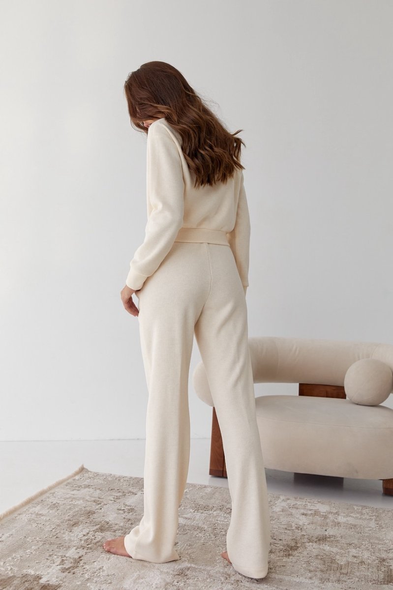Теплий жіночій костюм з джемпера і штанів. Джемпер по низу з манжетом, спереді застрочений защіп. Виріз горловини круглий, з планочкою. Рівень плеча спущений, рукава вшивні, довгі, з манжетом по низу. Штани прямі, на талії пояс із резинкою. Кишені з відрізним бочком. Передні половинки зі стрілками, які зафіксовані строчкою.